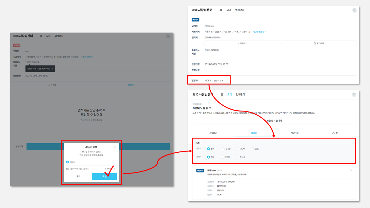 담당자 변경은 상담 수락 이후 바로 선택 가능한 창이 생성되며 이후 수정하기에서도 변경 가능합니다.