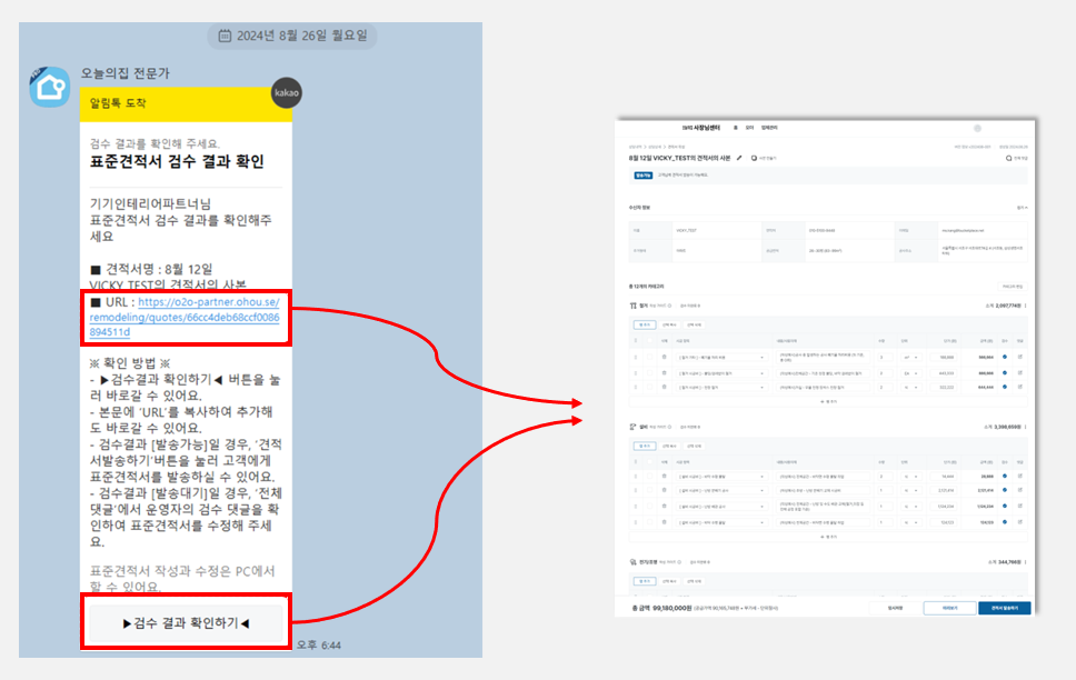운영자의 검수가 완료되면, 견적서 담당자에게 카카오톡 알람이 발송됩니다.