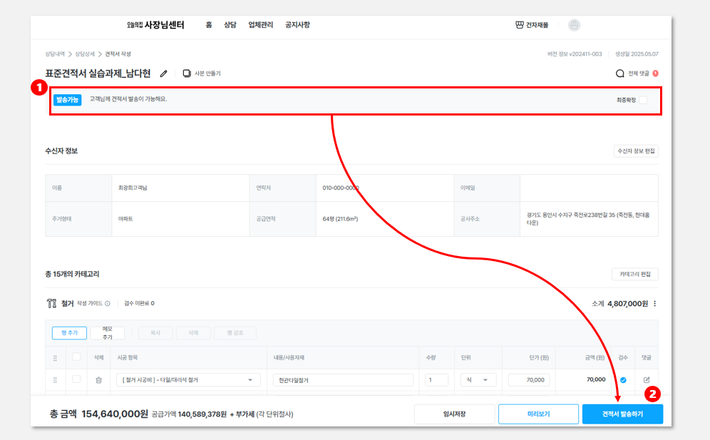 [견적서 발송하기] 버튼을 클릭하여 고객님께 견적서를 보내기 전 최종 내용을 확인합니다.