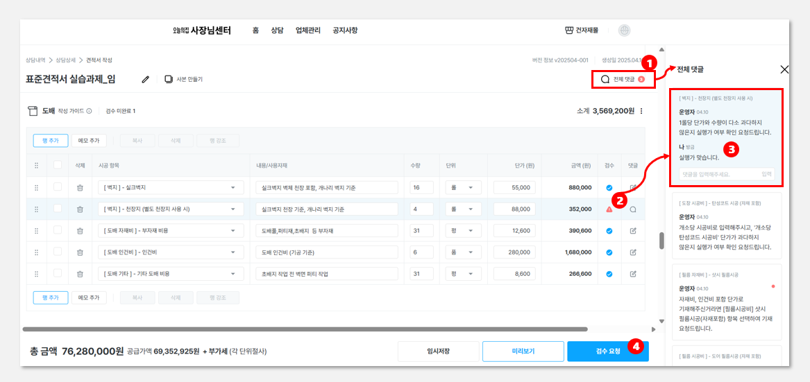 작성이 완료되면 운영자에게 검수요청 합니다.