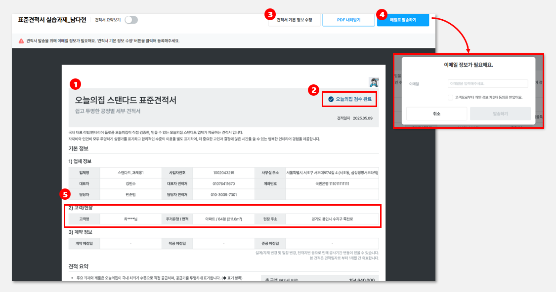 오늘의집 검수가 완료된 견적서의 상태로 계약서 작성시에는 반드시 검수 완료 상태로 계약이 가능