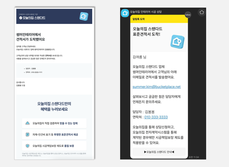 발송한 이메일은 아래와 같은 내용으로 견적서가 첨부되어 고객님께 발송되고, 메일이 발송되었음을 알리는 알림톡이 함께 고객님께 전송합니다.