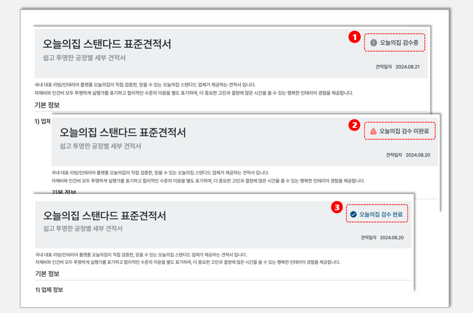 검수 요청이 넘어간 견적서에 대해서는 ‘오늘의집 검수중‘ 마크를 통해 오늘의집에서 검수중인 상황에 대한 표시