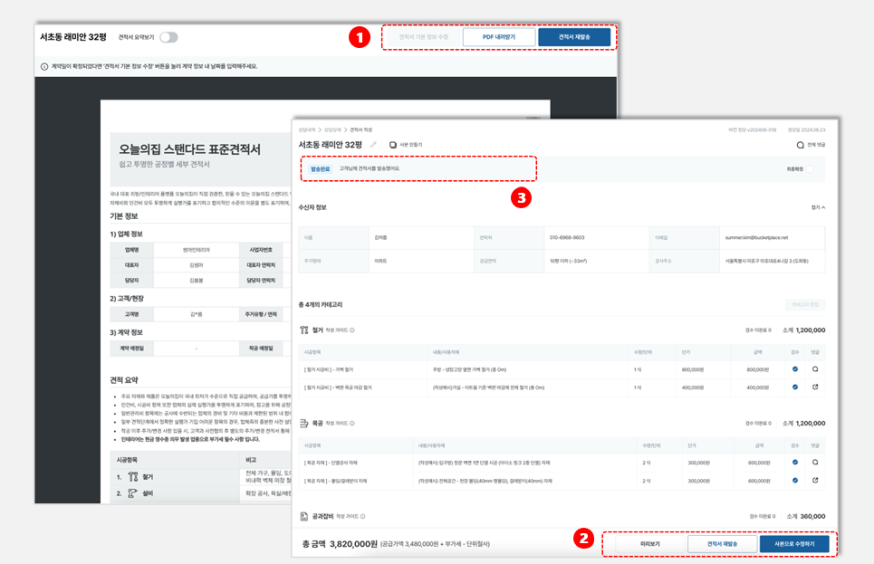 발송된 견적서는 수정할 수 없고, 고객님과 상담을 통해 견적 내용 수정이 필요하면 [사본으로 수정하기] 버튼을 클릭해서 작성합니다.