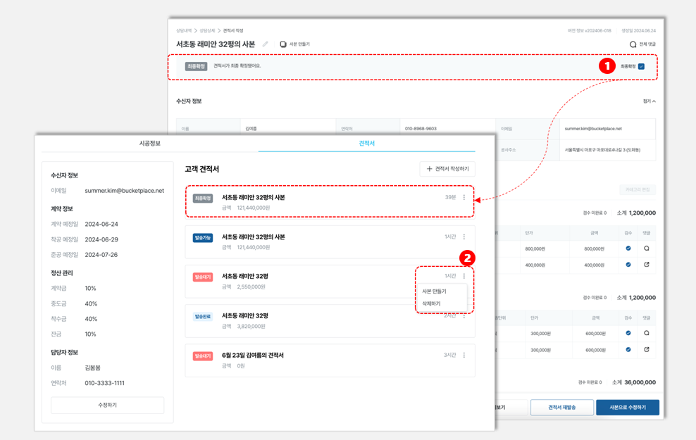 고객님께 발송한 견적서 중 계약에 최종 합의한 견적서가 있다면 [최종확정] 체크박스에 체크해야 함. 이후진행 될 계약서 및 변경내역서 작성에 해당 정보가 참조가능