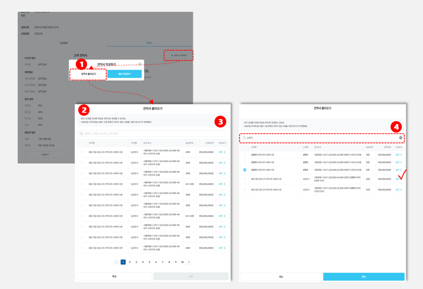 - 버튼을 클릭하면 최근 작성한 견적서 리스트 팝업창이 노출