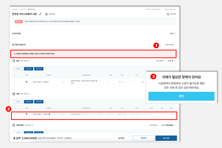현재 제공되지 않는 시공항목 혹은 오늘의집 건자재 항목을 삭제하지 않으면, [검수요청] 버튼 클릭 시 삭제요청 팝업창이 노출됨