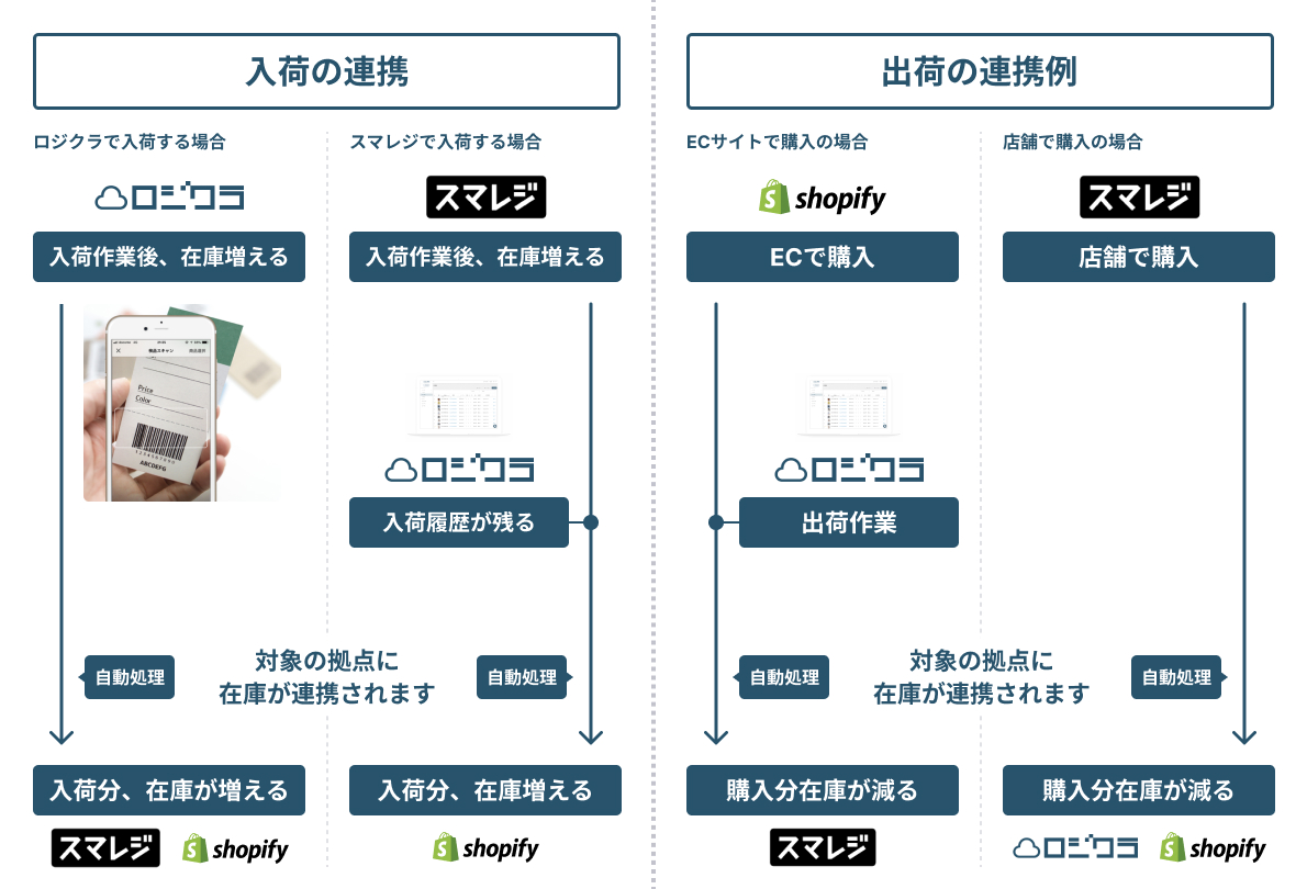 店舗で利用しているスマレジ(POS)の在庫をロジクラに連携することで、倉庫と店舗の在庫を一貫して確認することができます。