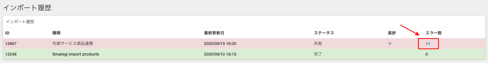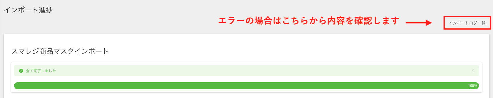 ※失敗した場合、「インポートログ一覧」のエラー数より失敗した原因を確認します。