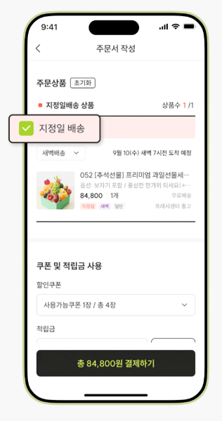 : 구매하기 → [지정일 배송] 체크 → 원하는 날짜 선택
