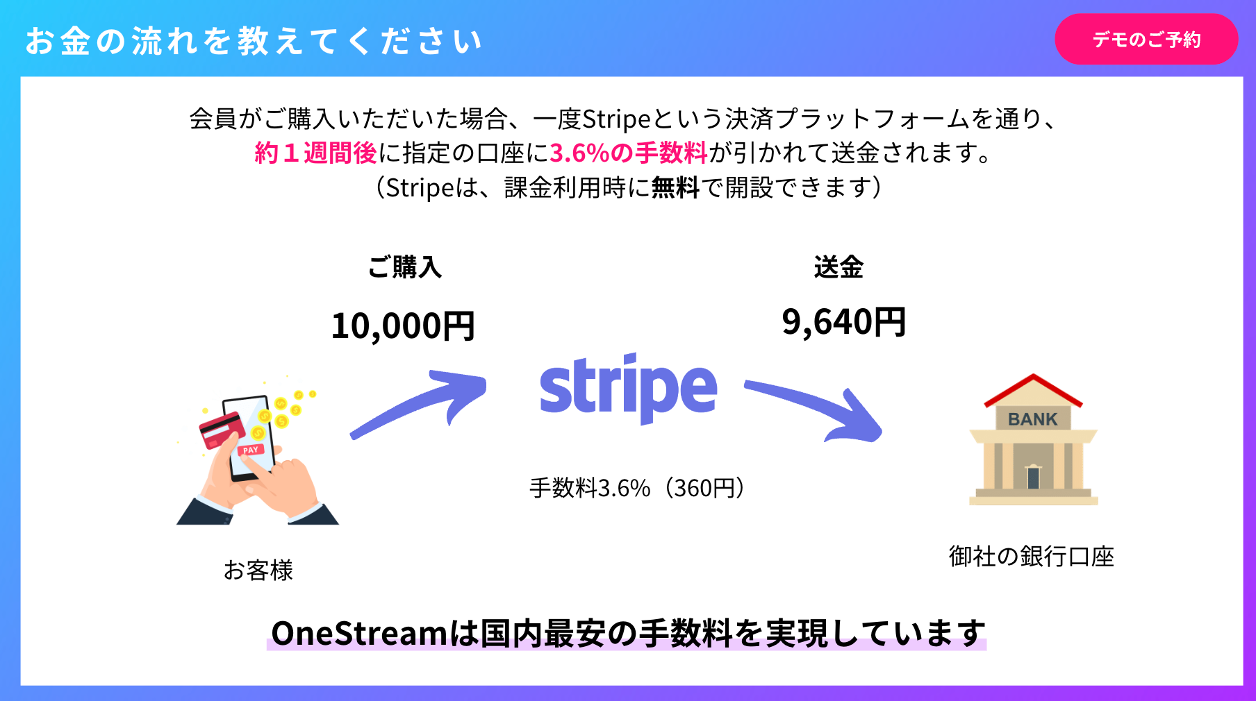 会員が購入した場合、一度Stripeという決済プラットフォームを通り、約1週間後に指定の口座に3.6%の手数料が引かれて送金されます。
