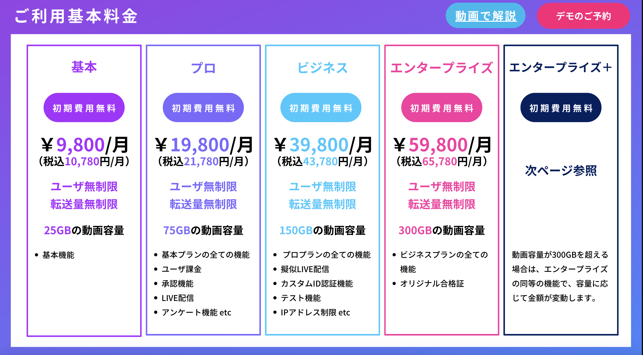 それぞれのプランを教えてください基本、プロ、ビジネス、エンタープライズの4つのプランを用意しています。それぞれのプランを動画の保存容量と機能の違いによって分かれます。プランの詳細はこちらをご確認ください。