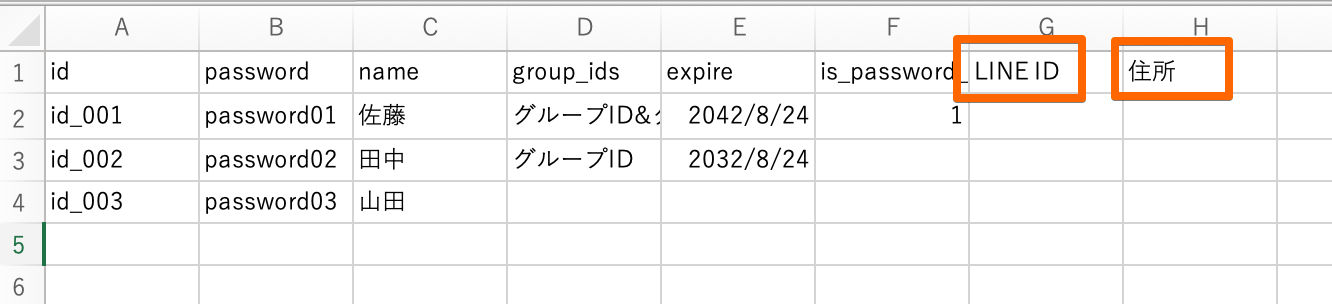 カスタムID認証でCSV取り込み時にカスタム項目を追加する方法①項目カスタマイズより追加したい項目を作成今回は「LINE ID」「住所」を追加します②ユーザー管理→会員→一括取り込み③CSVテンプレートダウンロード④ダウンロードしたCSVの項目に①で作成した項目を追加項目は作成頂いたそのままをコピしてください⑤CSVファイルをドラック&ドロップもしくはクリックして選択し取り込む追加した項目が取り込まれました