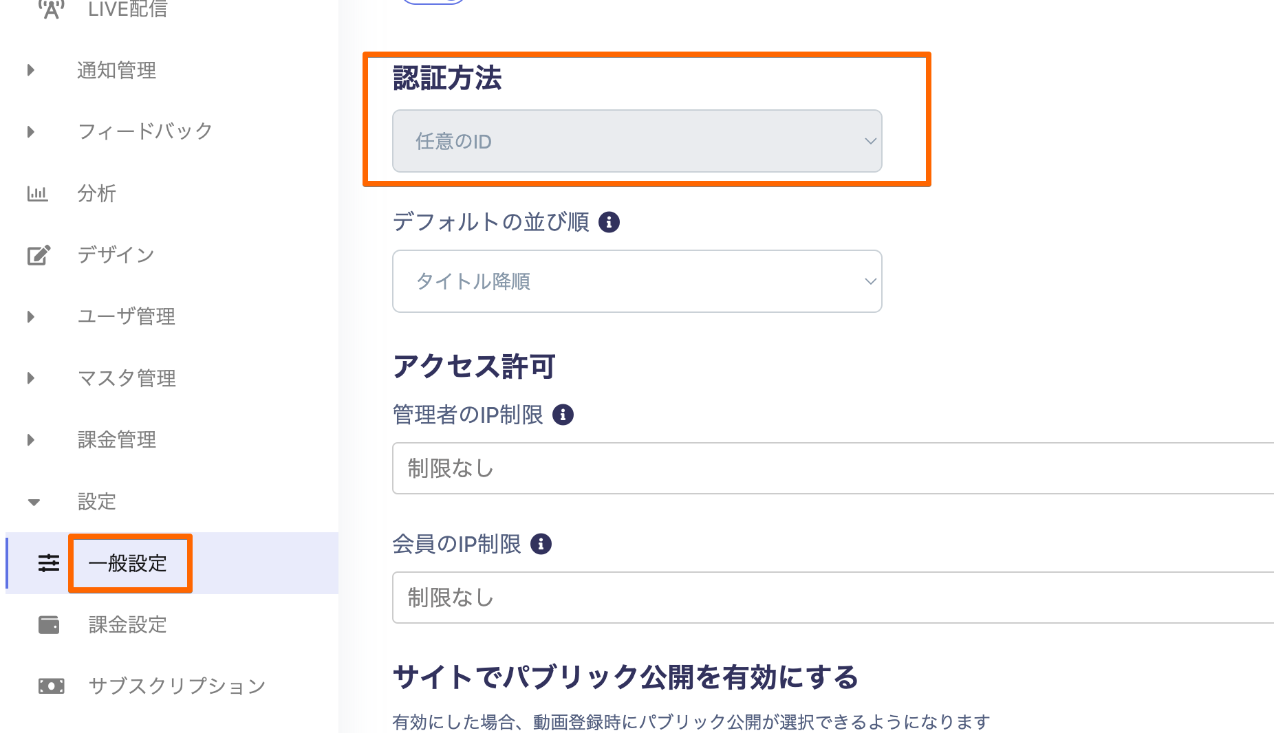 1.「認証方法」のドロップダウンリストから「任意のID」を選択します。