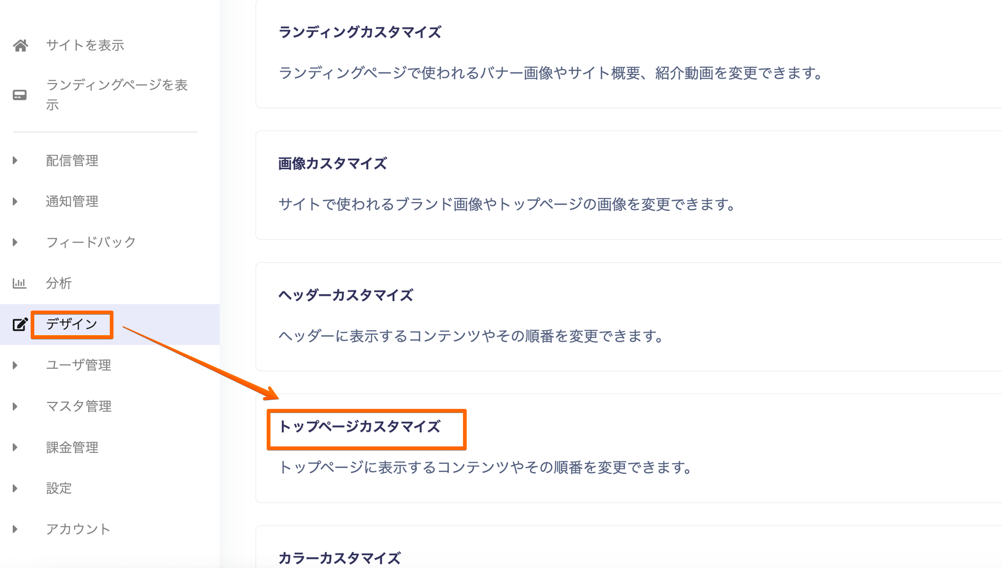 【デザイン】⇒【トップページカスタマイズ】より、TOPページに表示したいコンテンツリストを選択ください。