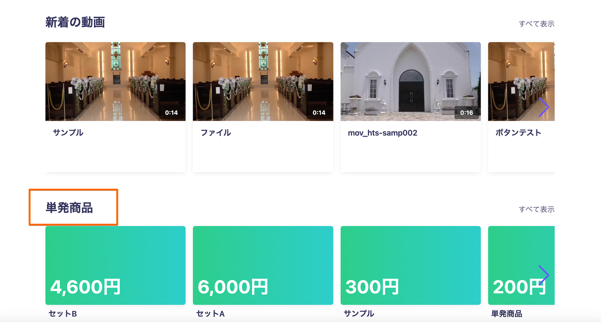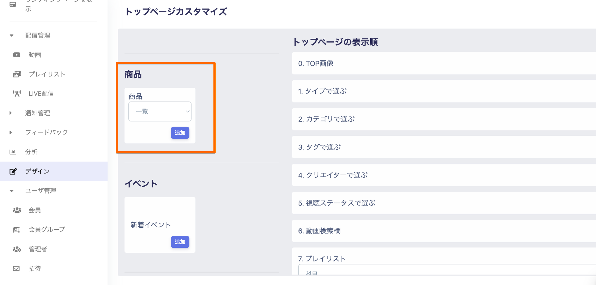 サイト上に商品を表示させる方法サイト上に商品一覧を表示させることが可能です。(表示件数は最大7件となります)①デザイン→トップページカスタマイズ→商品を追加サイト上で商品をクリックするとどの動画が紐づいているか確認することも可能です