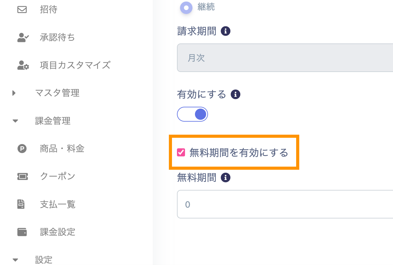 サブスクの無料お試し期間を設定する方法はありますか?課金管理→商品・料金→サブスクの新規登録「無料期間を有効にする」にチェックを入れて頂き、無料期間の日数を設定ください。※設定できる期間は最大2年間となります