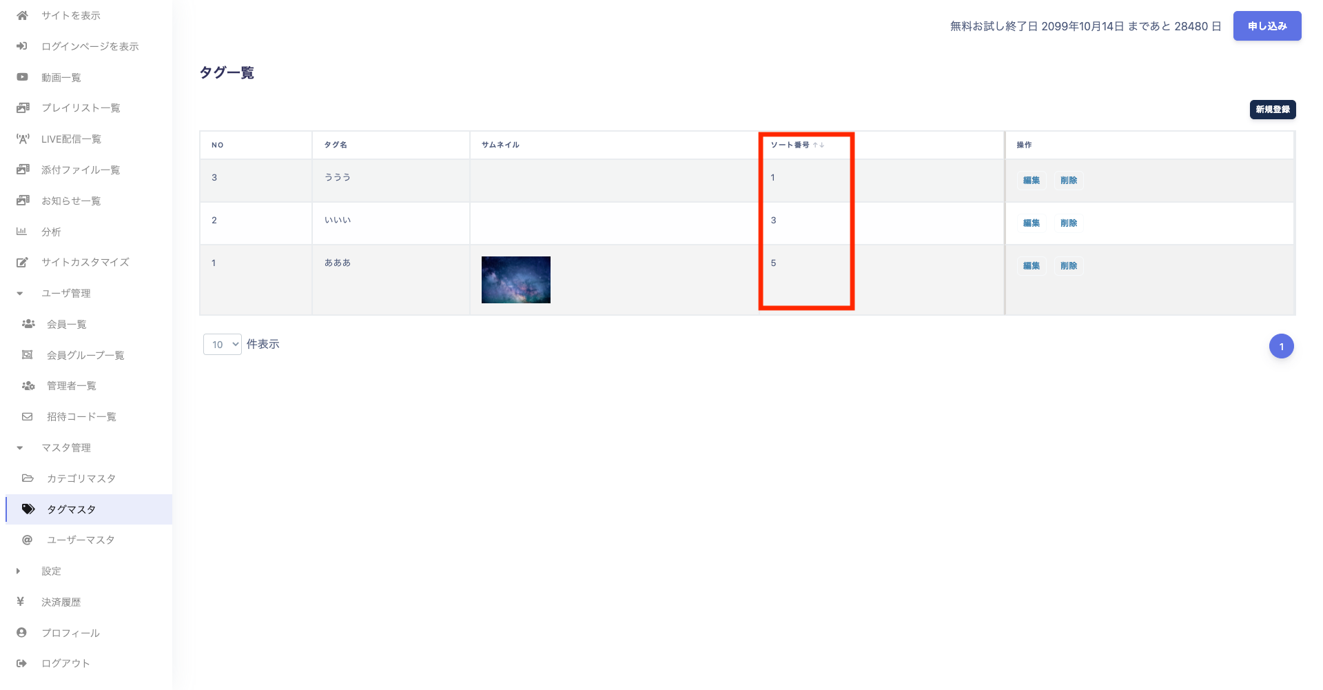 会員画面の方でソート番号が1⇨3⇨5の順番で左からタグが表示されます