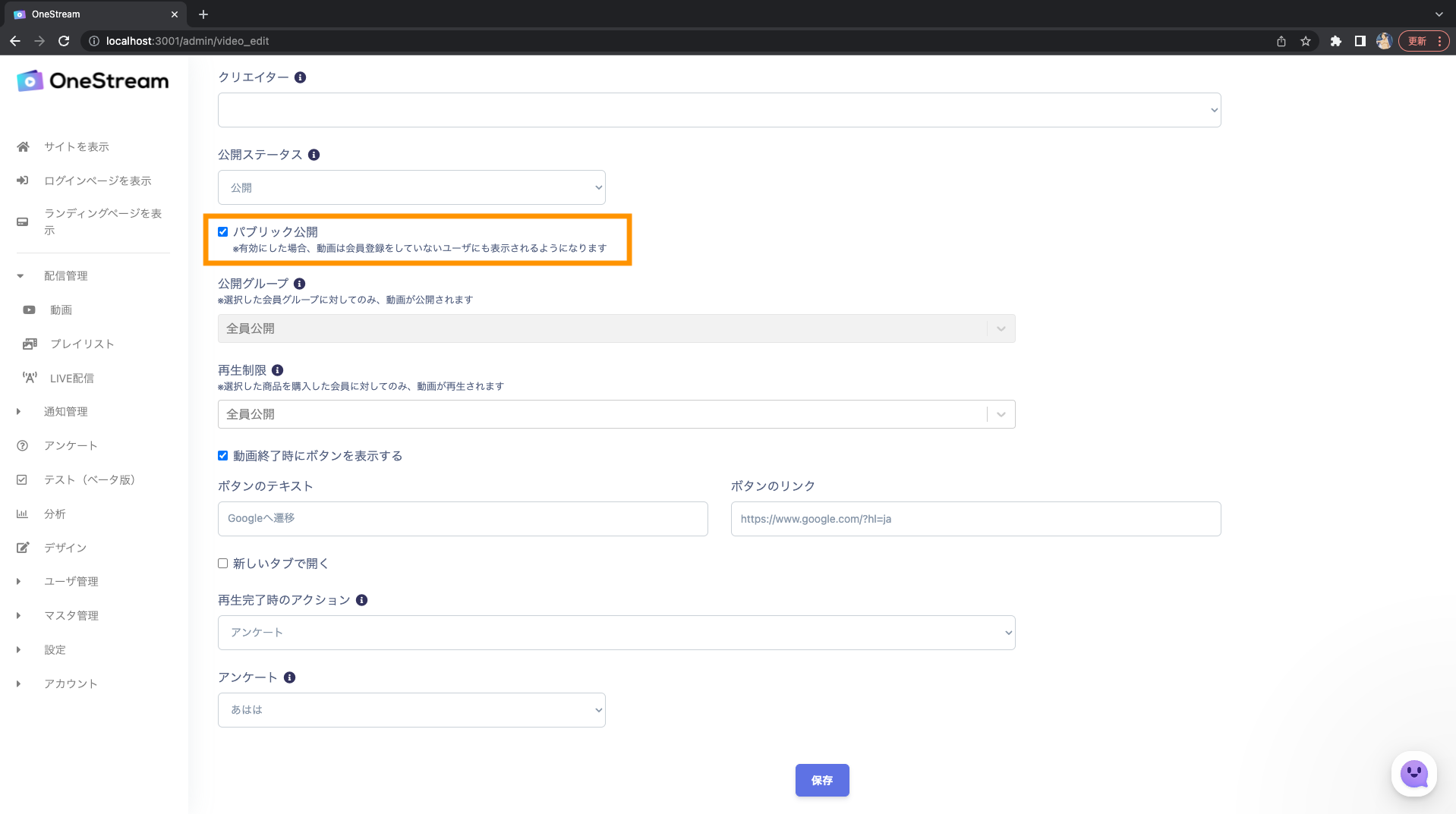 •パブリック公開にチェックを入れると、ランディングページ(一般公開用のページ)から対象の動画を視聴できるようになります