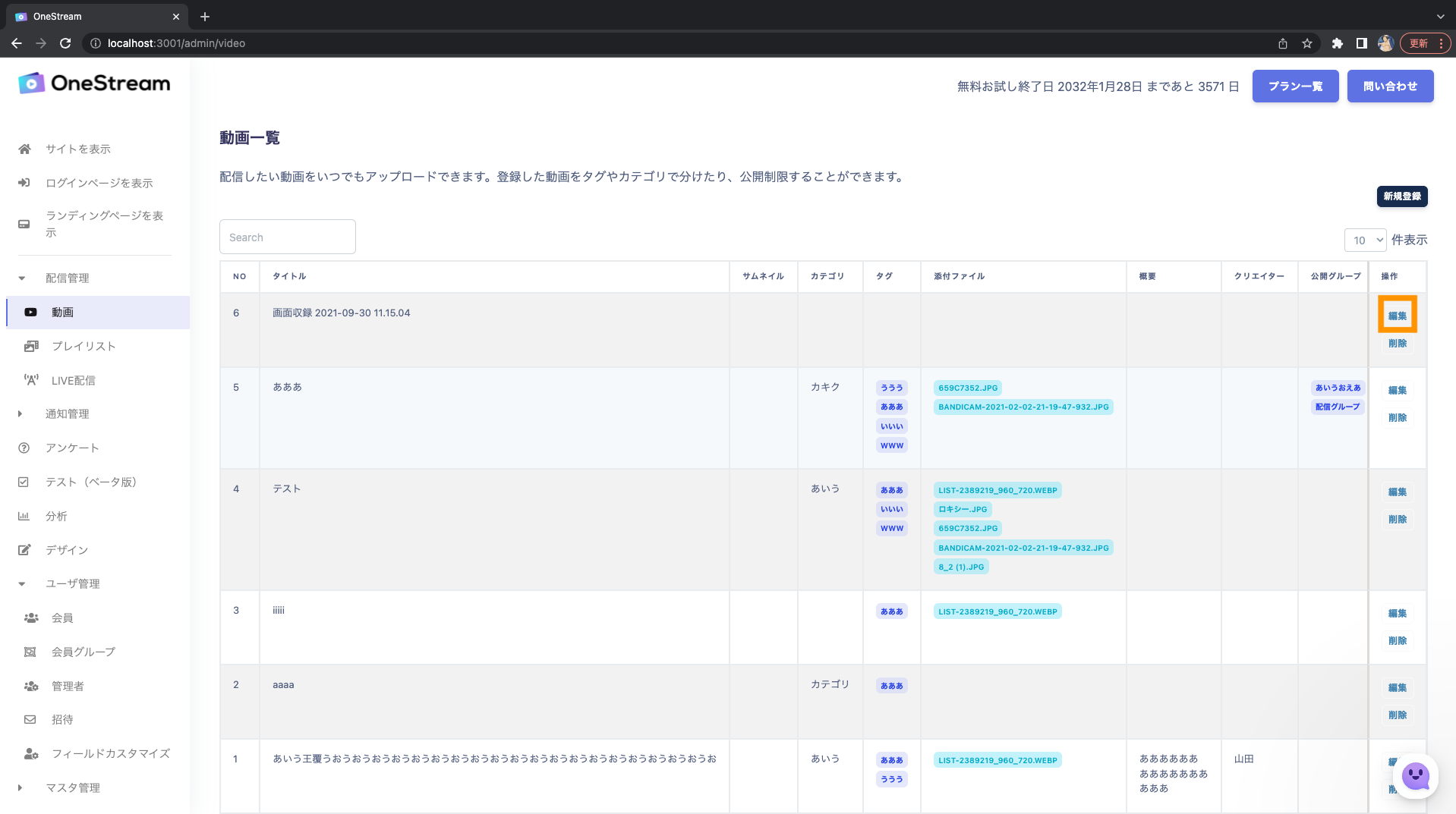 •OneStreamのメニューより【配信管理】→【動画】を選択してください