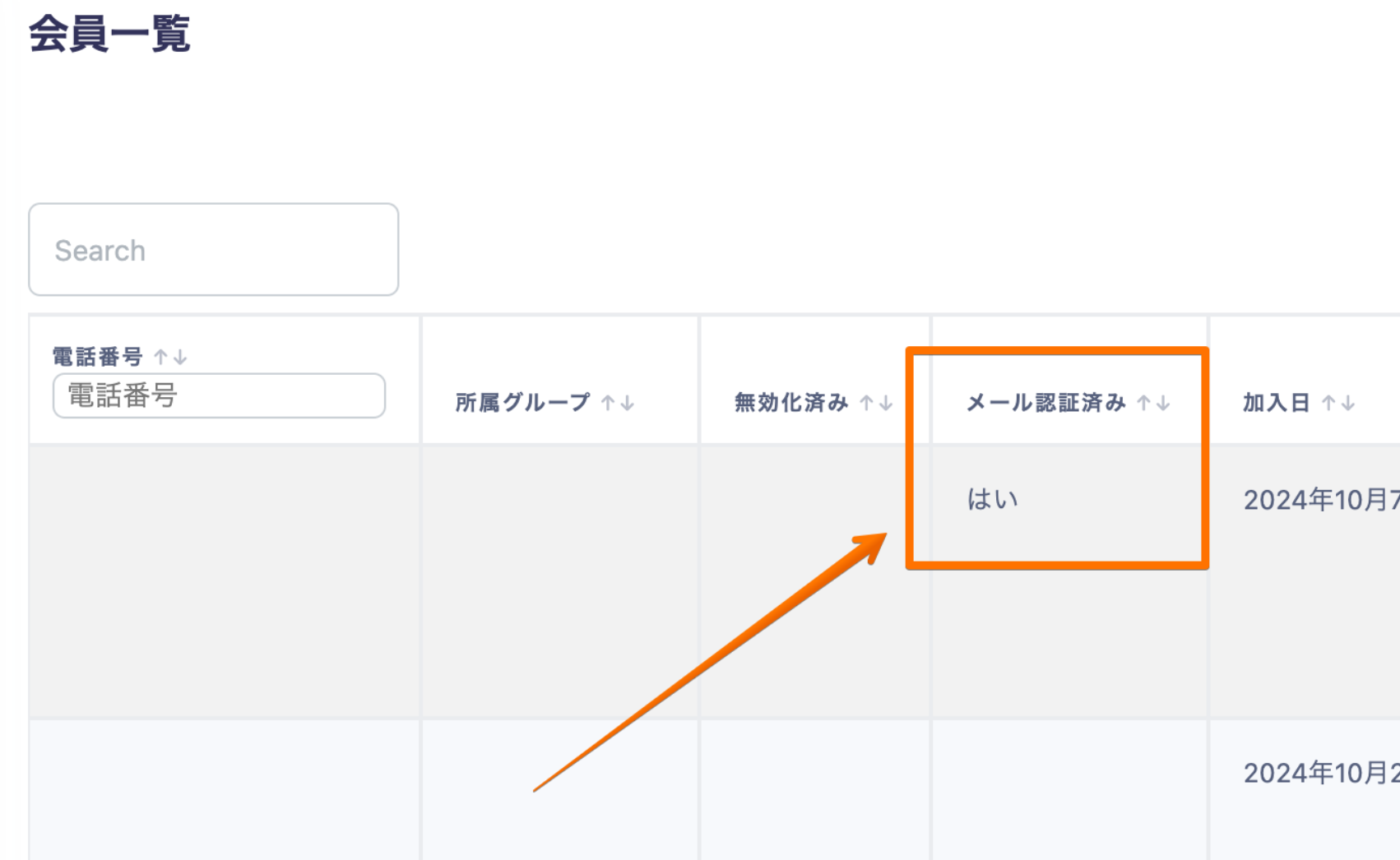 アカウントを作成すると会員一覧に登録されますが、メール内のURLにて認証をされていない場合は下記の「メール認証済み」の箇所は空白となります。