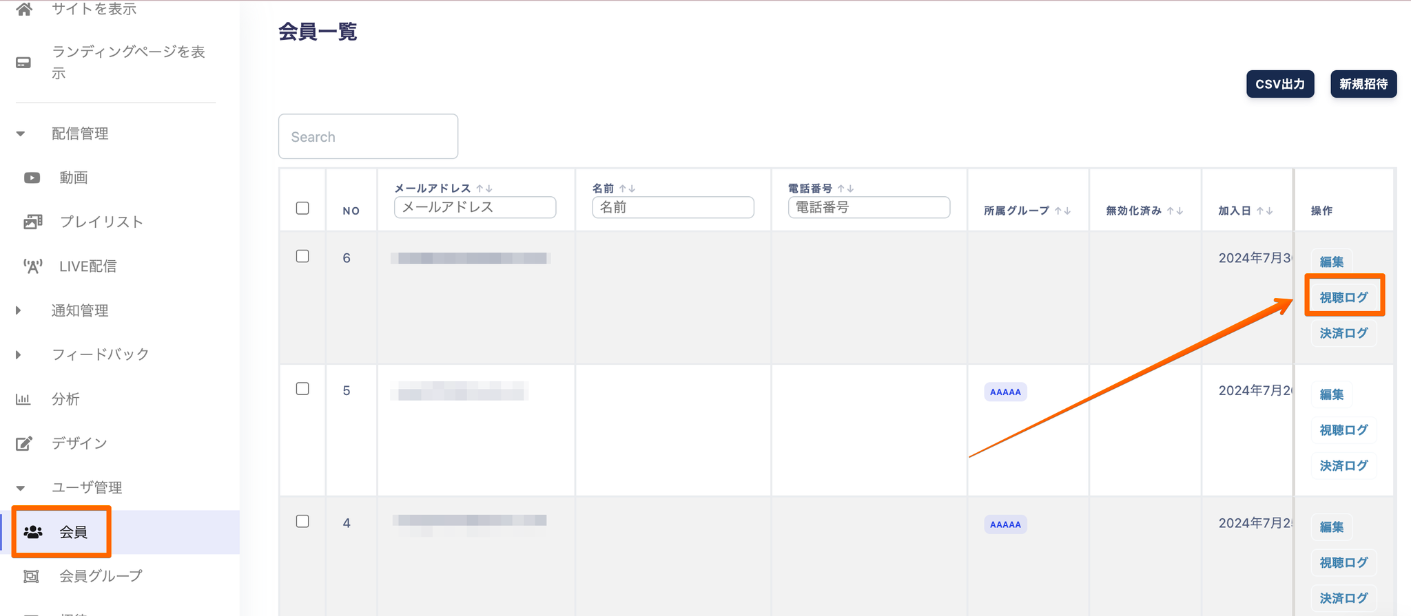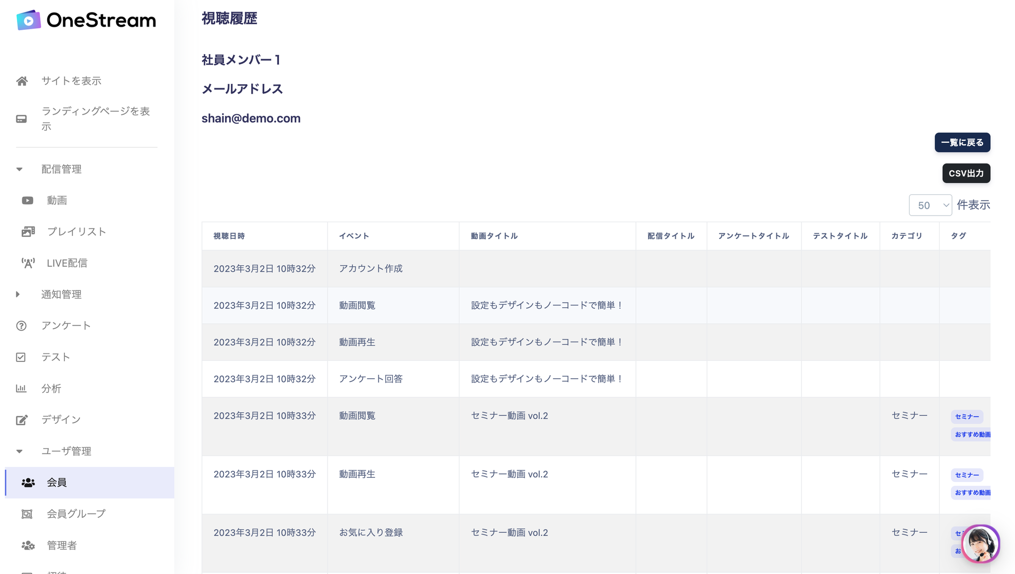 該当のユーザの視聴ログに移動すると、最近の視聴履歴が表示されます。ここでは、動画のタイトル、視聴日時、などの情報を確認することができます