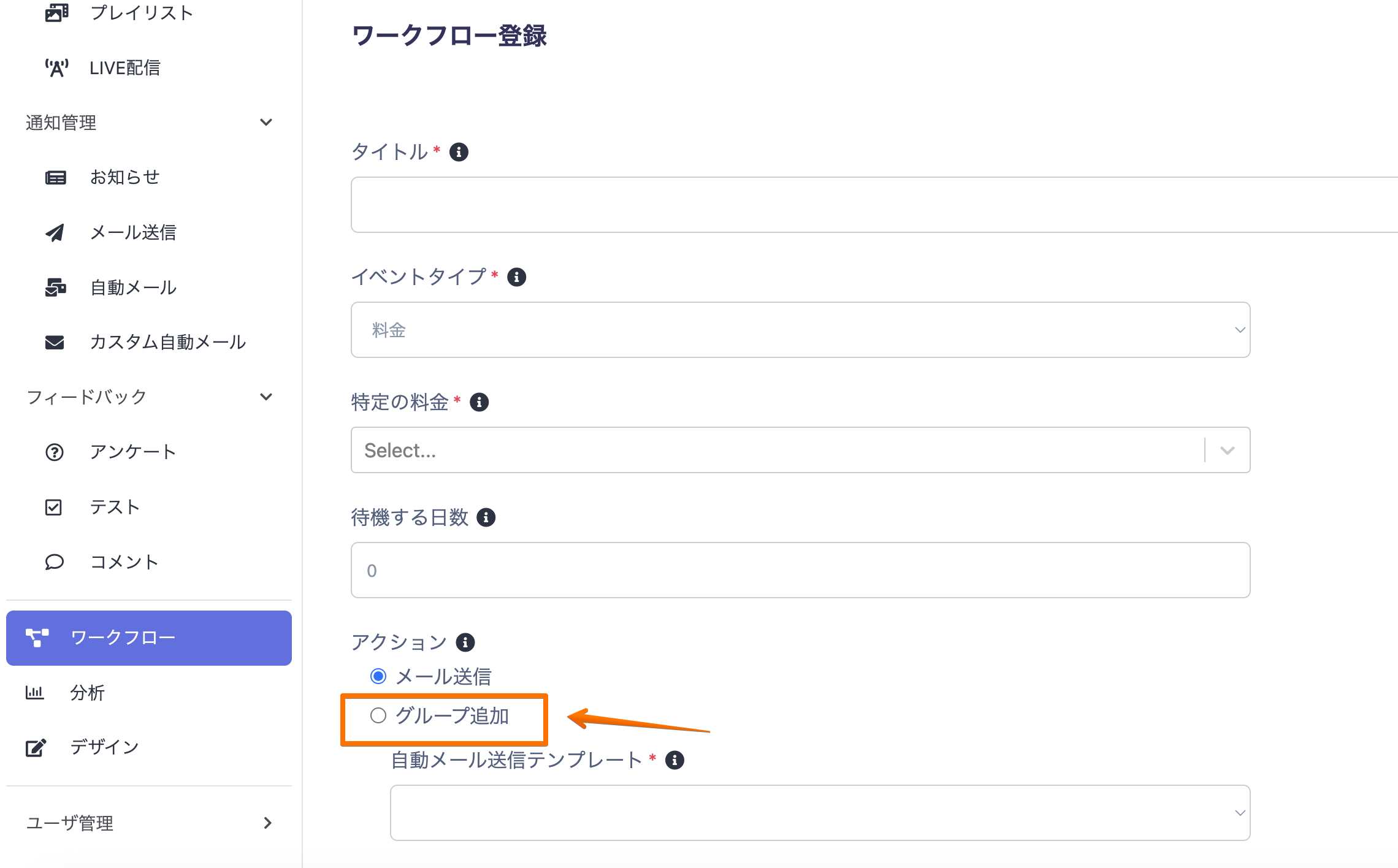 ・特定の料金:どの料金を購入した際にグループを追加するか、料金を選択ください(複数選択可能)