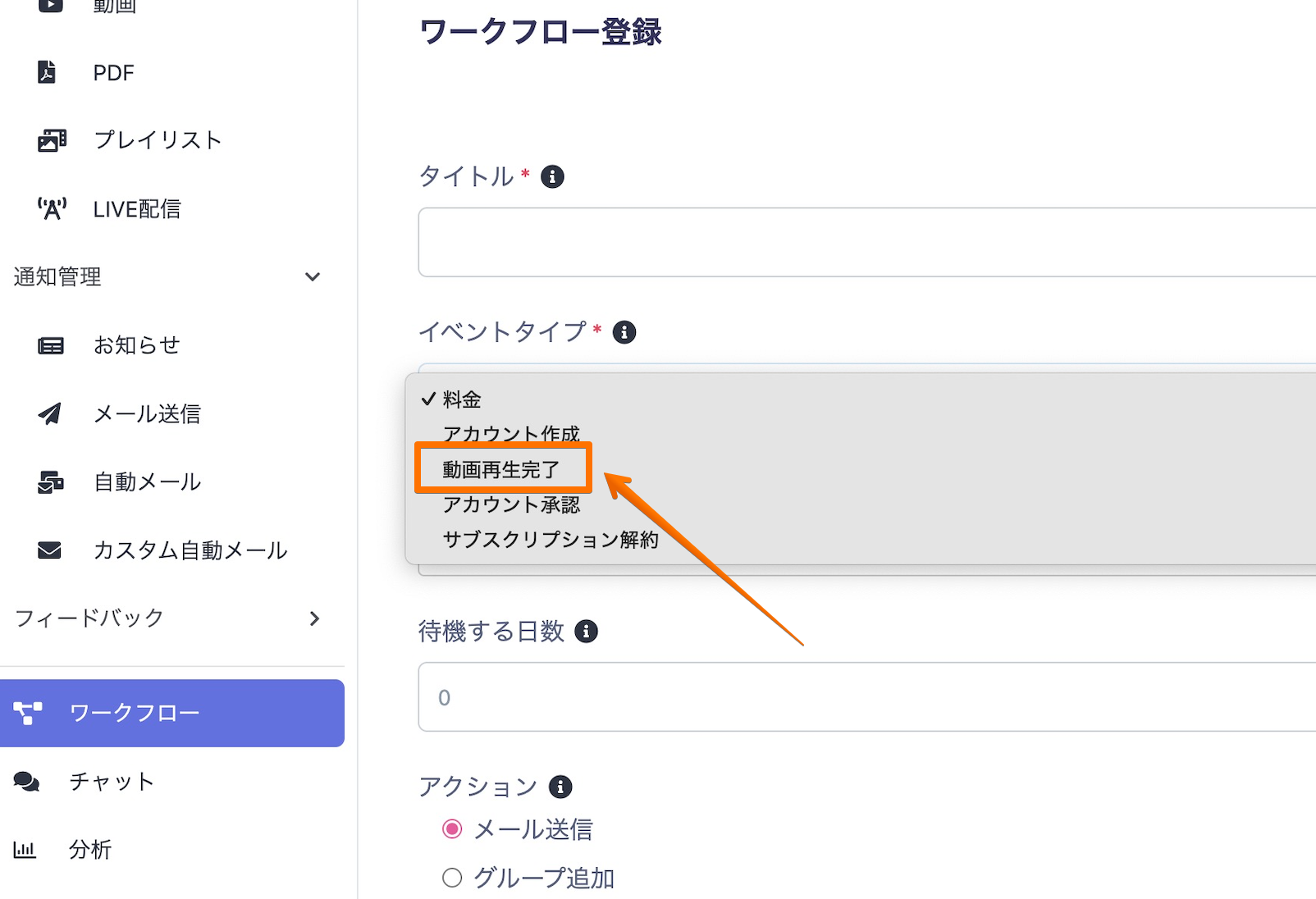 この設定を行うことで、ユーザーが動画を最後まで視聴した時点で、グループを追加したり、メールを送信することが可能です