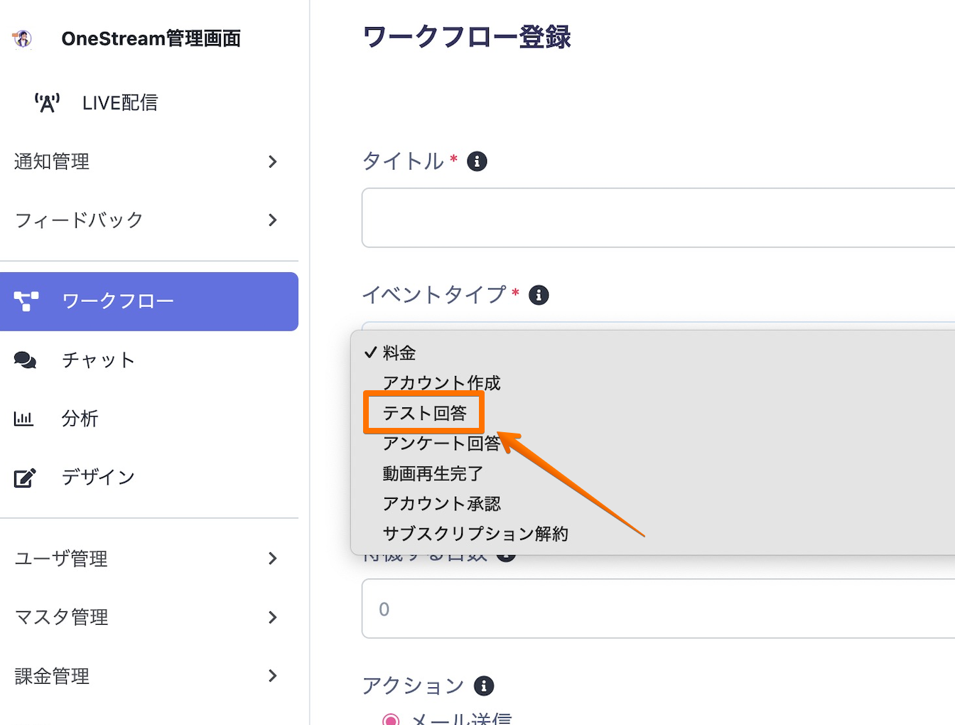 例:イベントタイプ設定、テスト回答後に管理者にメールを送付する方法