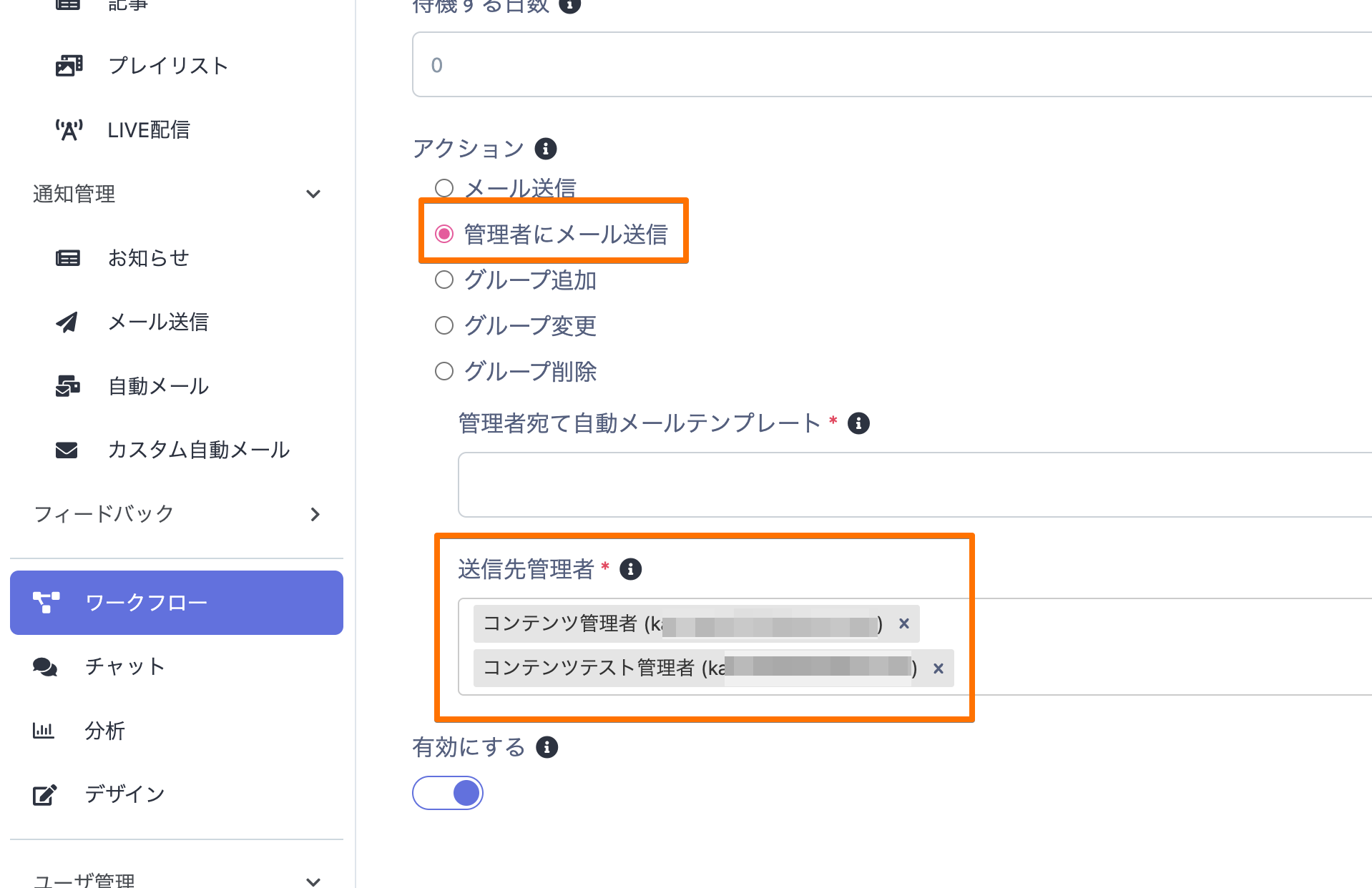 この設定を行うことで、ユーザーがテストに回答した時点で、管理者にメールを送付することができ、管理者は即時回答を確認したり分析したりすることが可能です。