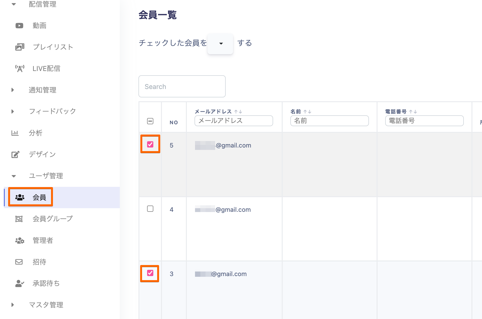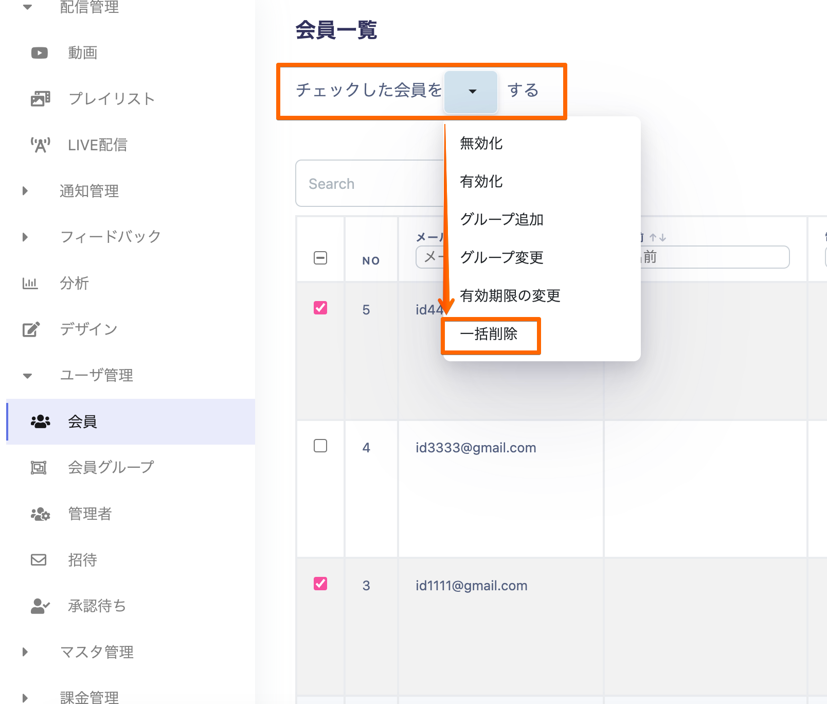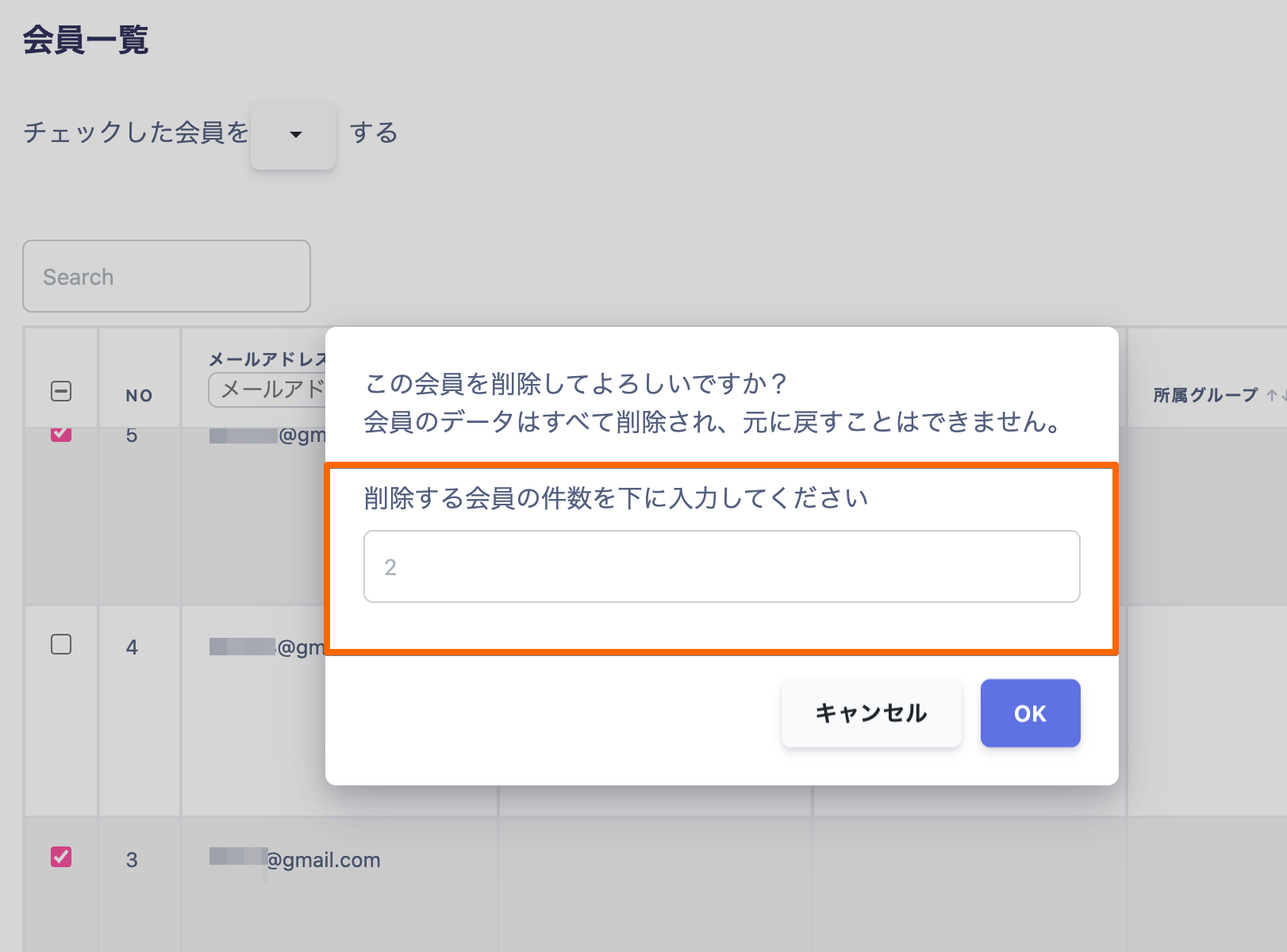 会員の一括削除の方法ユーザー管理→会員→削除した対象の会員にチェック下記の箇所であれば一括でチェックを入れることも可能ですプルダウンより一括削除を選択削除する件数を入力後「OK」を押下よくある質問会員の無効化と会員の削除の違いを教えてください