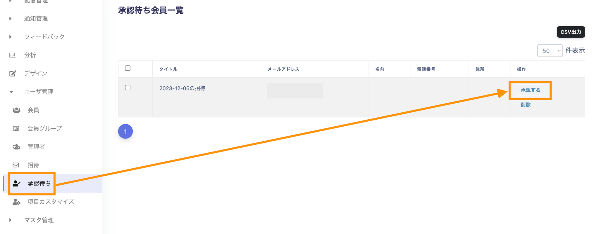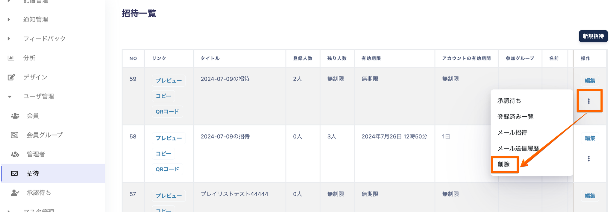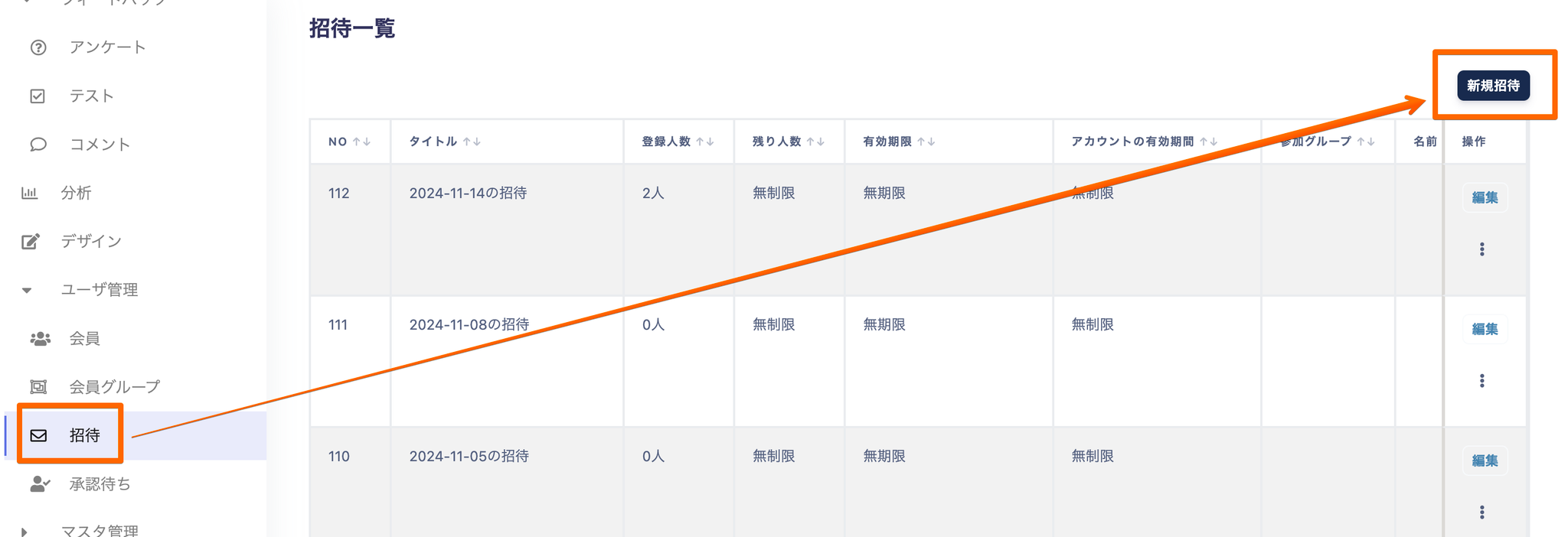 サイドメニューのユーザ管理から招待→新規招待を押下