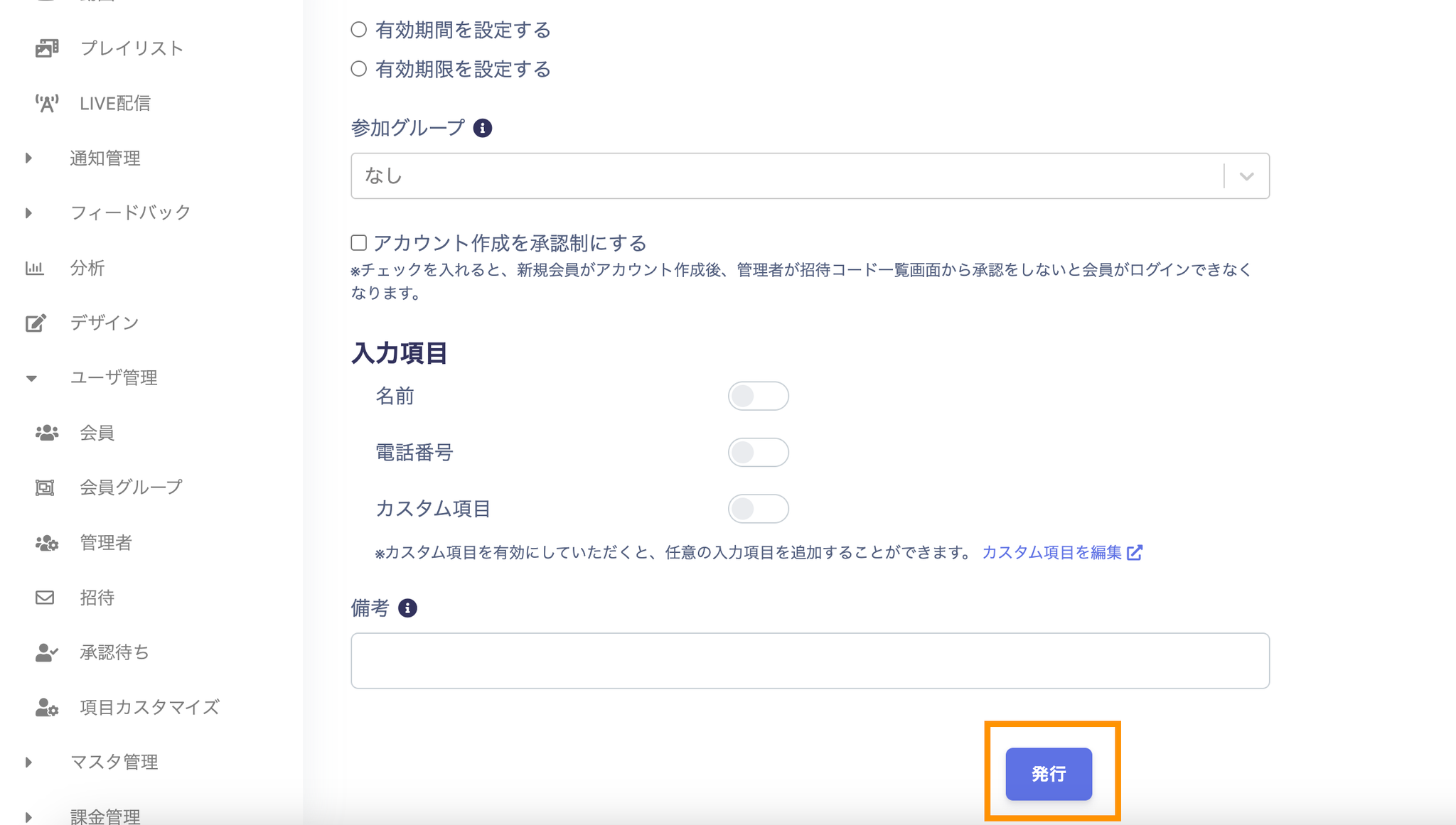 •入力項目:入力項目を選択した状態で招待コードを発行すると、アカウント作成時に選択した任意の項目の入力を求められる