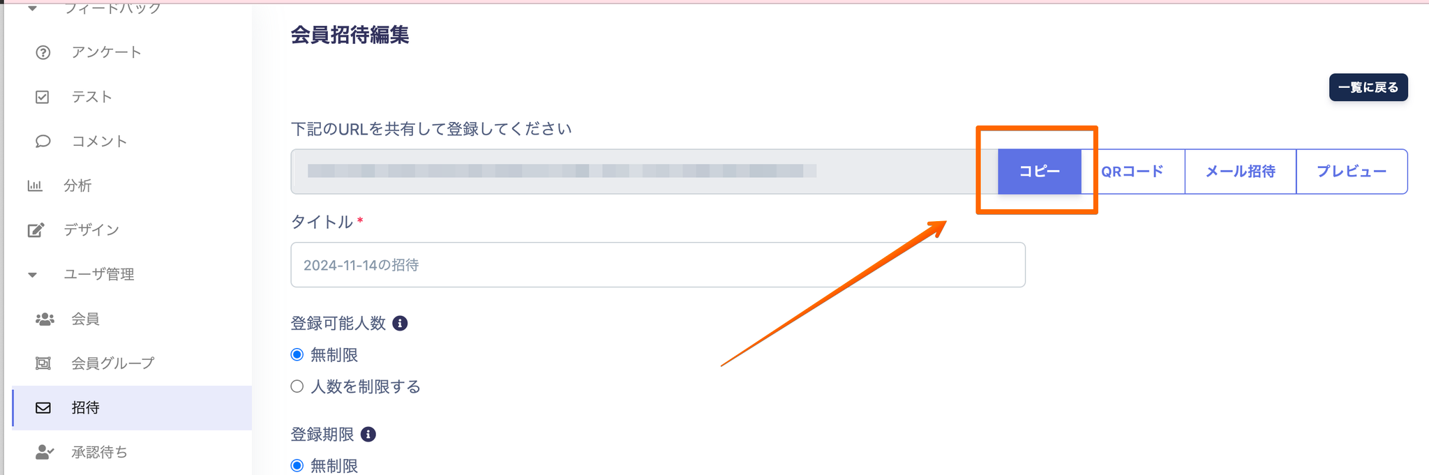 •登録期限:発行したURLで会員登録できる期限を設定します