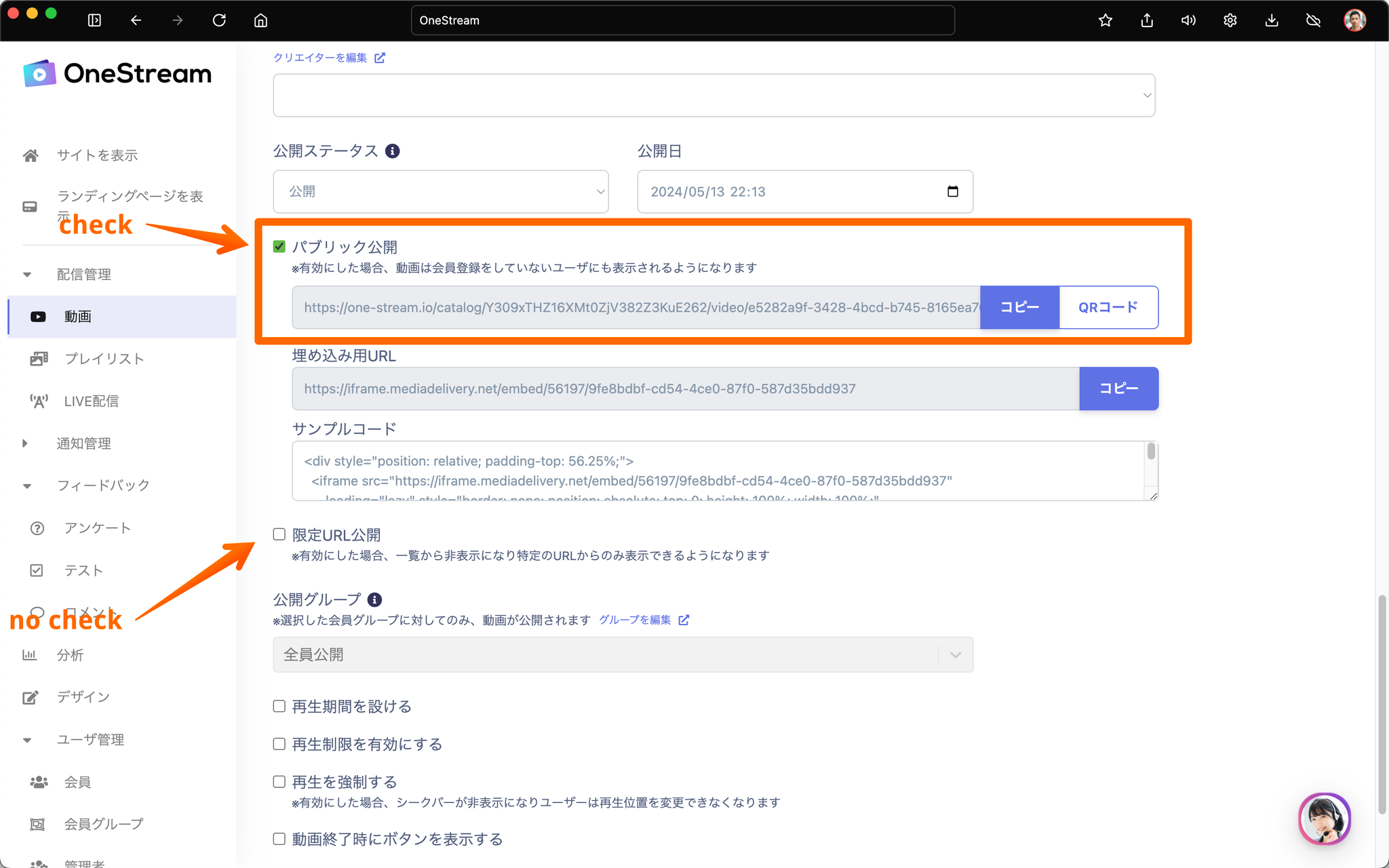 ② 動画の編集(作成)画面で「限定URL公開」にチェックを入れていない