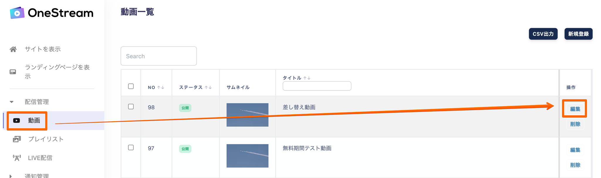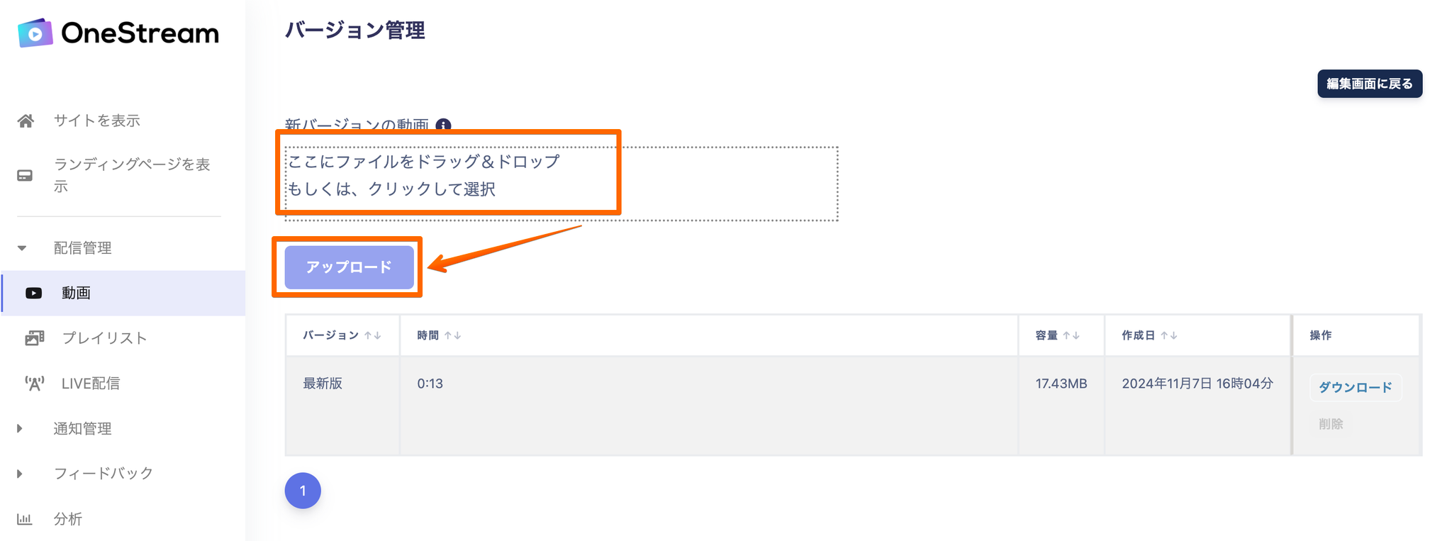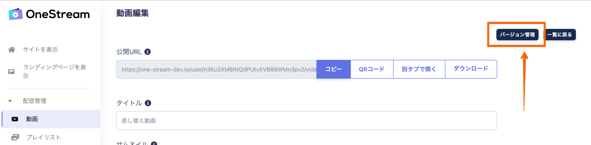 動画を差し替える方法URLを変えずに、既存の動画を新しい動画に差し替えることが可能です後で字幕を入れたり、修正や内容を一部変更したい場合などに活用ください1. 配信管理→動画→対象動画の編集2. バージョン管理3. 差し替えたい動画をドラッグ&ドロップ、またはクリックして選択→アップロード※埋め込み用配信をご利用の場合、埋め込み用URLは変更されますのでご注意ください。