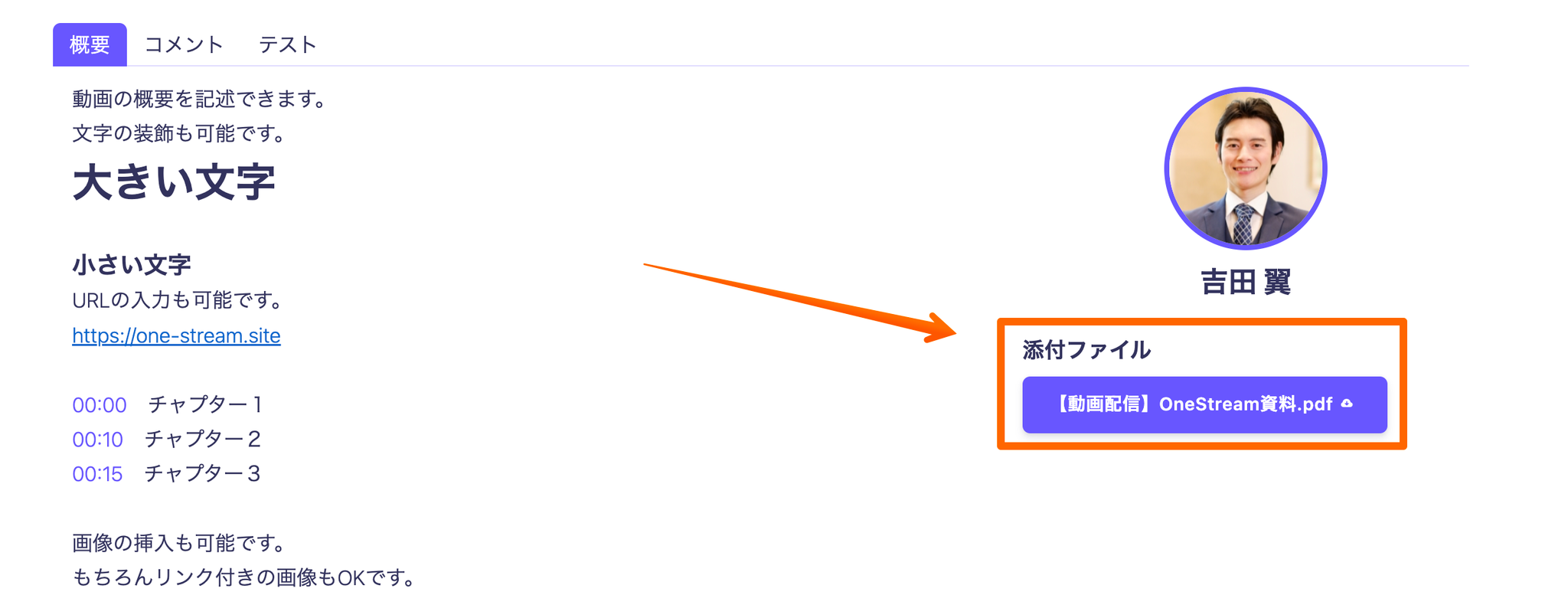 OneStreamでは動画以外でも、pdfやwordなど様々なファイルを添付し、視聴者に配布することができます。