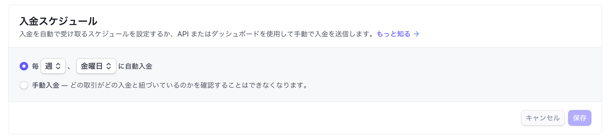 •入金スケジュールはStripeの設定より変更可能です(週/曜日・月/日)
