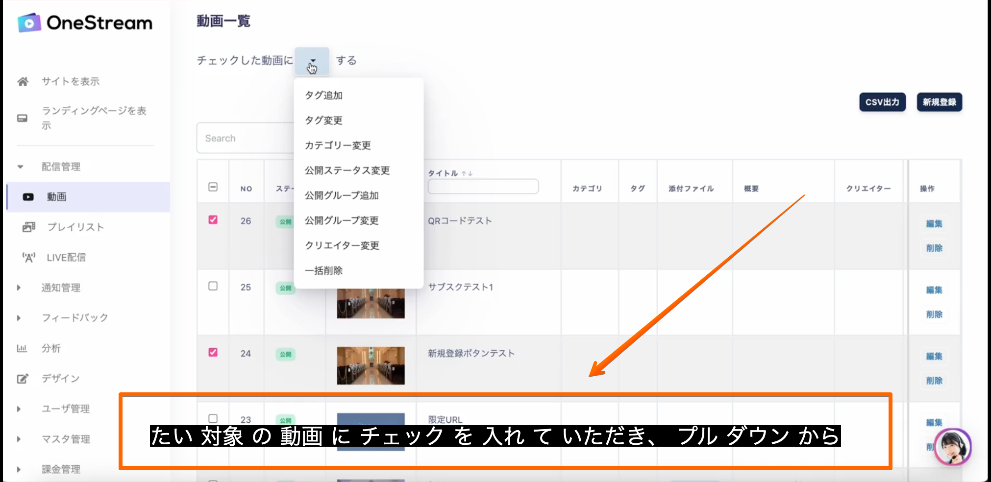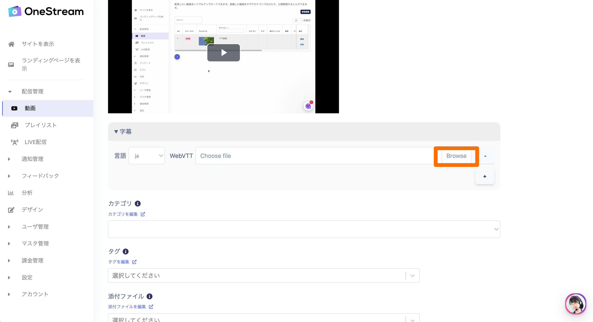 OneStreamの動画編集画面で字幕を追加するには、VTTファイルを用意しアップロードする方法と、AIによる自動字幕の設定(日本語のみ)の2通りあります。