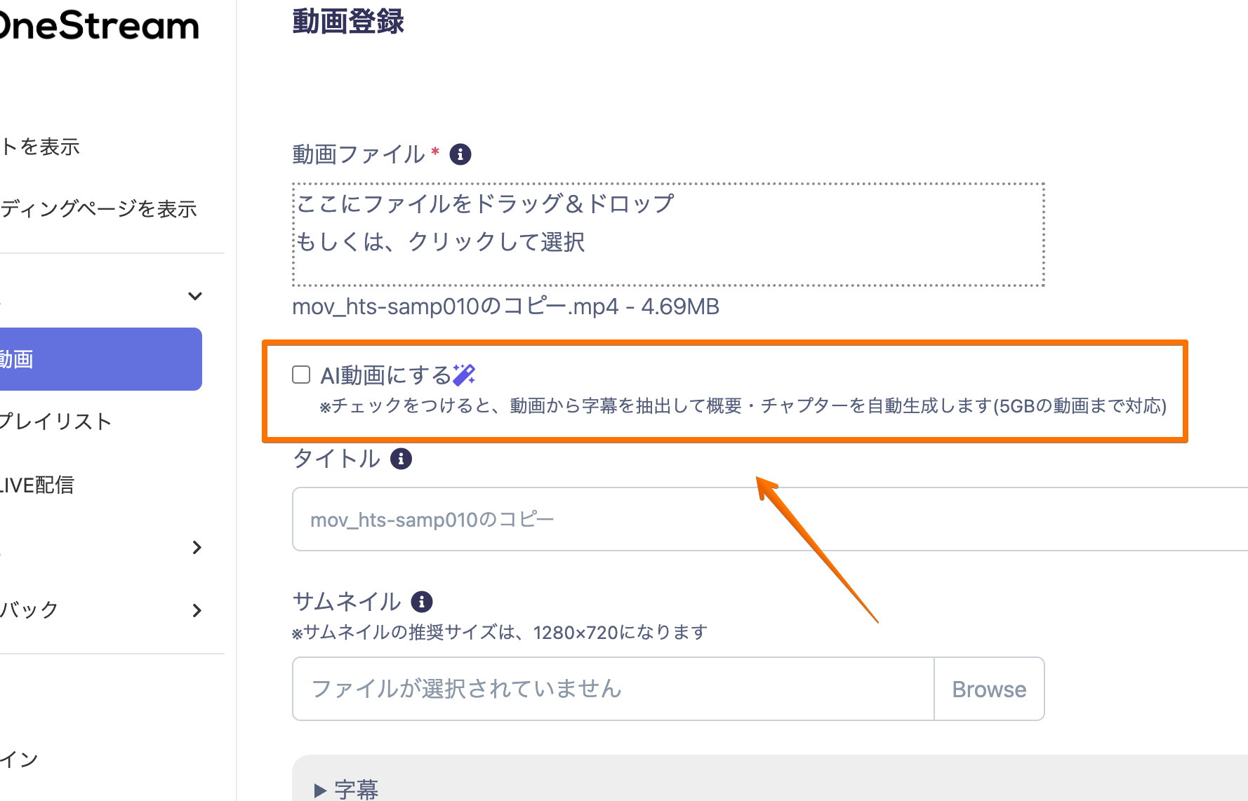 ☑︎チェックを入れると字幕や概要、チャプターが生成されます(5GBまでの動画に対応)