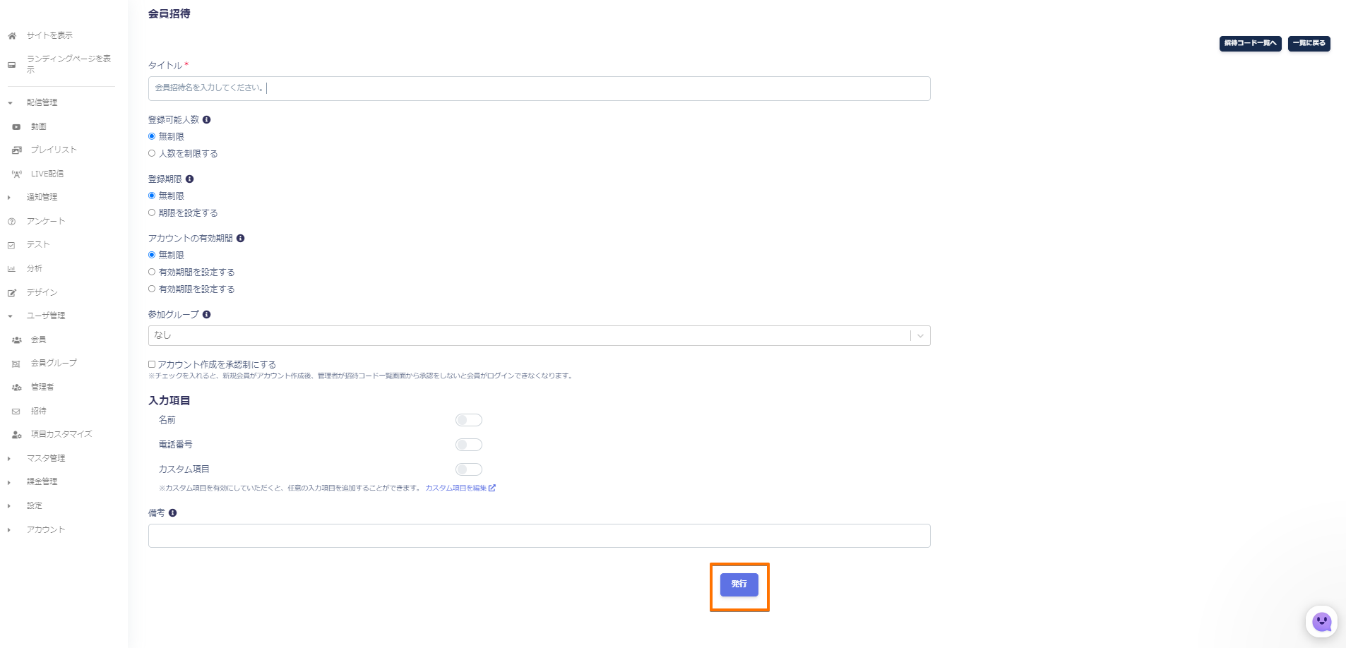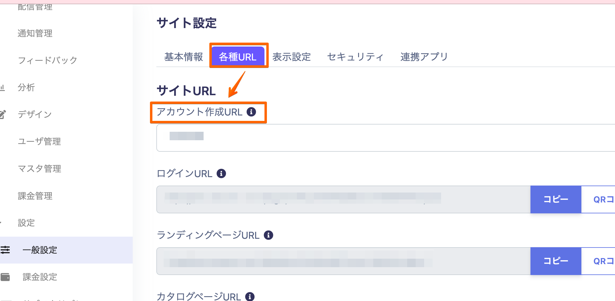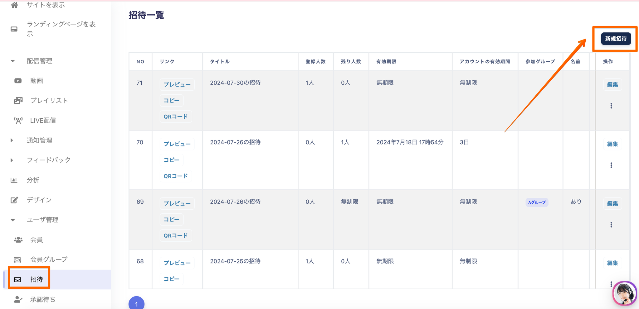 新規登録をサイトに表示するまずは【新規招待】ボタンから招待用のリンクを作成していただきます会員招待のリンクを発行します設定⇒→一般設定→サイト設定→各種URLアカウント作成URLで会員招待のリンクの設定をしますそうすると新規登録ボタンが表示されるようになります