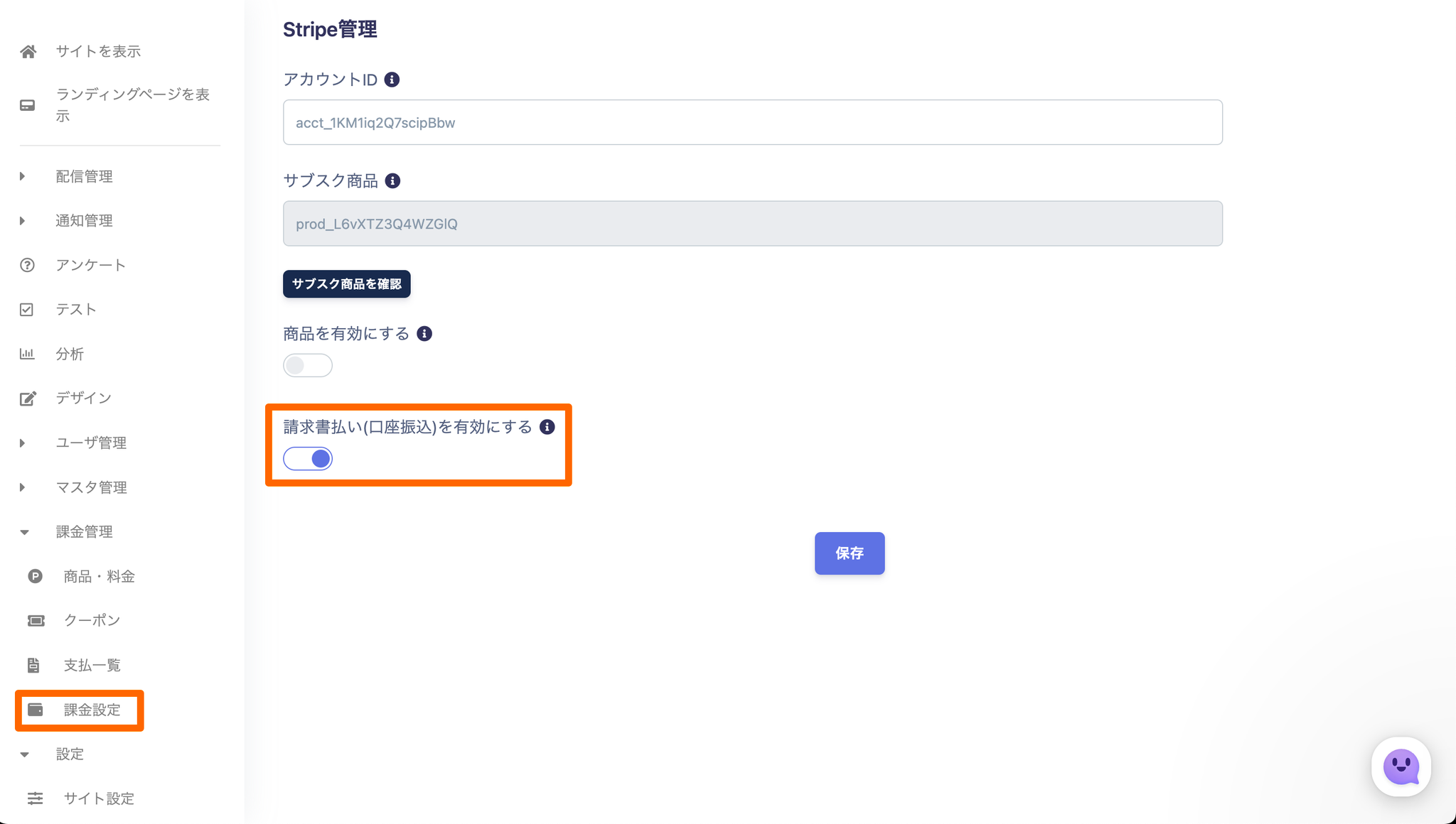 銀行振り込みを扱う課金管理⇒Stripe管理にて、請求書払い(口座振込)を有効にするをONにして保存してくださいStripeにて銀行口座の支払い方法を有効にしてくださいhttps://dashboard.stripe.com/settings/payment_methods