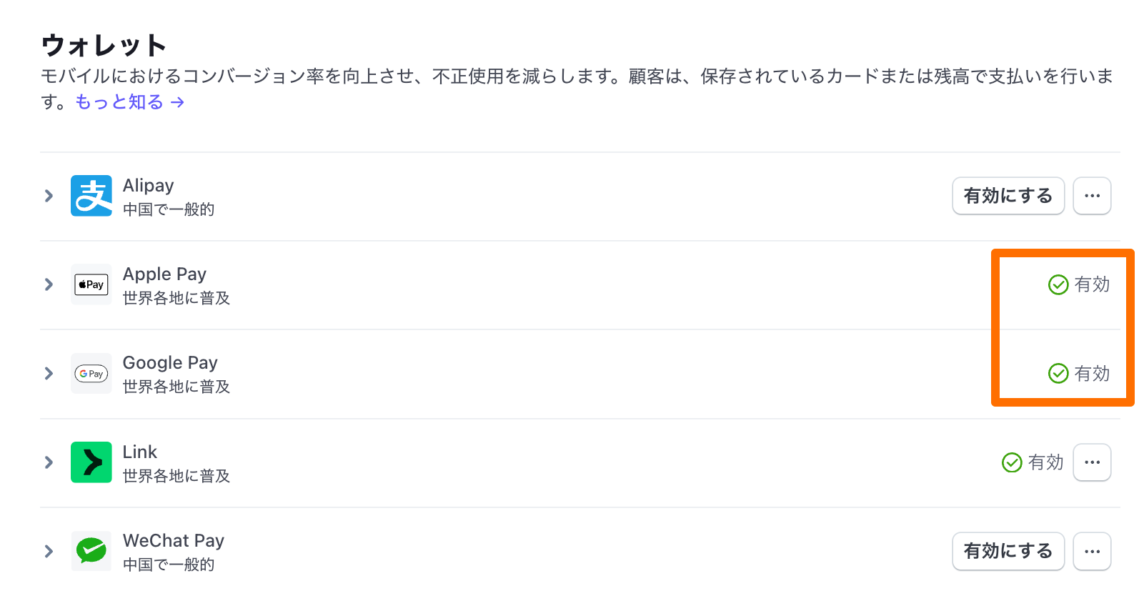 決済でApple Pay・Google Payを扱うStripeにてApple Pay・Google Payの支払い方法を有効にしてくださいhttps://dashboard.stripe.com/settings/payment_methods