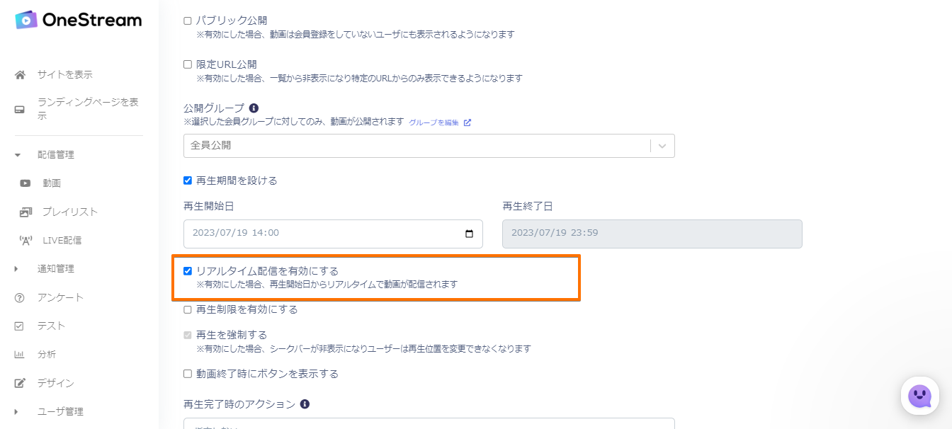リアルタイム配信を有効にするのかで