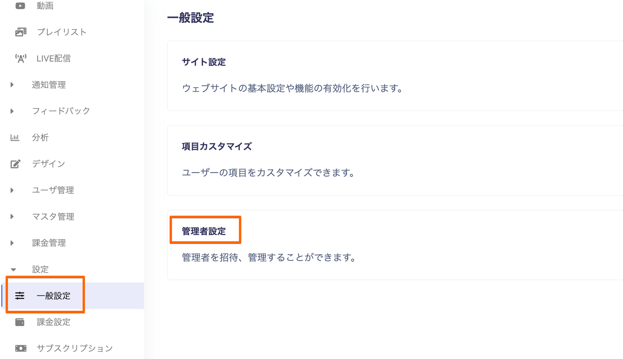 一般設定、管理者管理、サブスクリプション