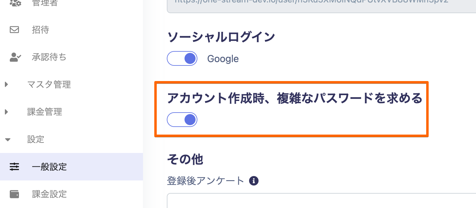 設定→一般設定→サイト設定の「アカウント作成時、複雑なパスワードを求める」