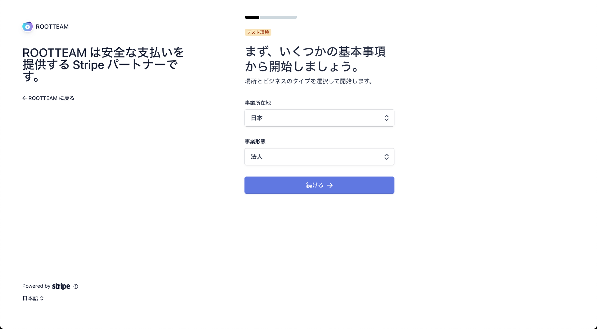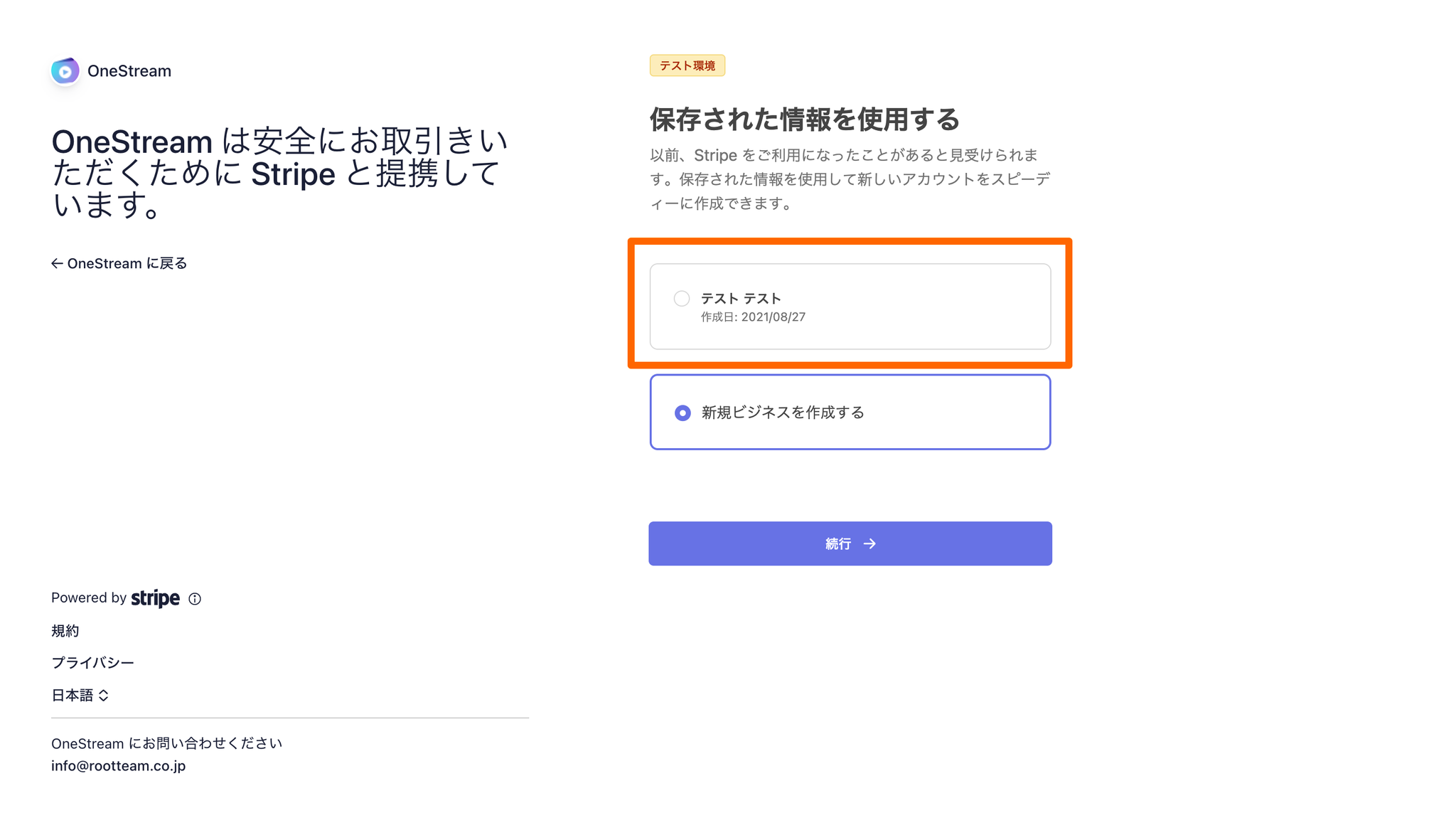 Stripeアカウントに既存のビジネスが紐づいている場合は、下記のように、既存のビジネスが選択できます。なければ、「新規ビジネスを作成する」を押して再度申請してくさい