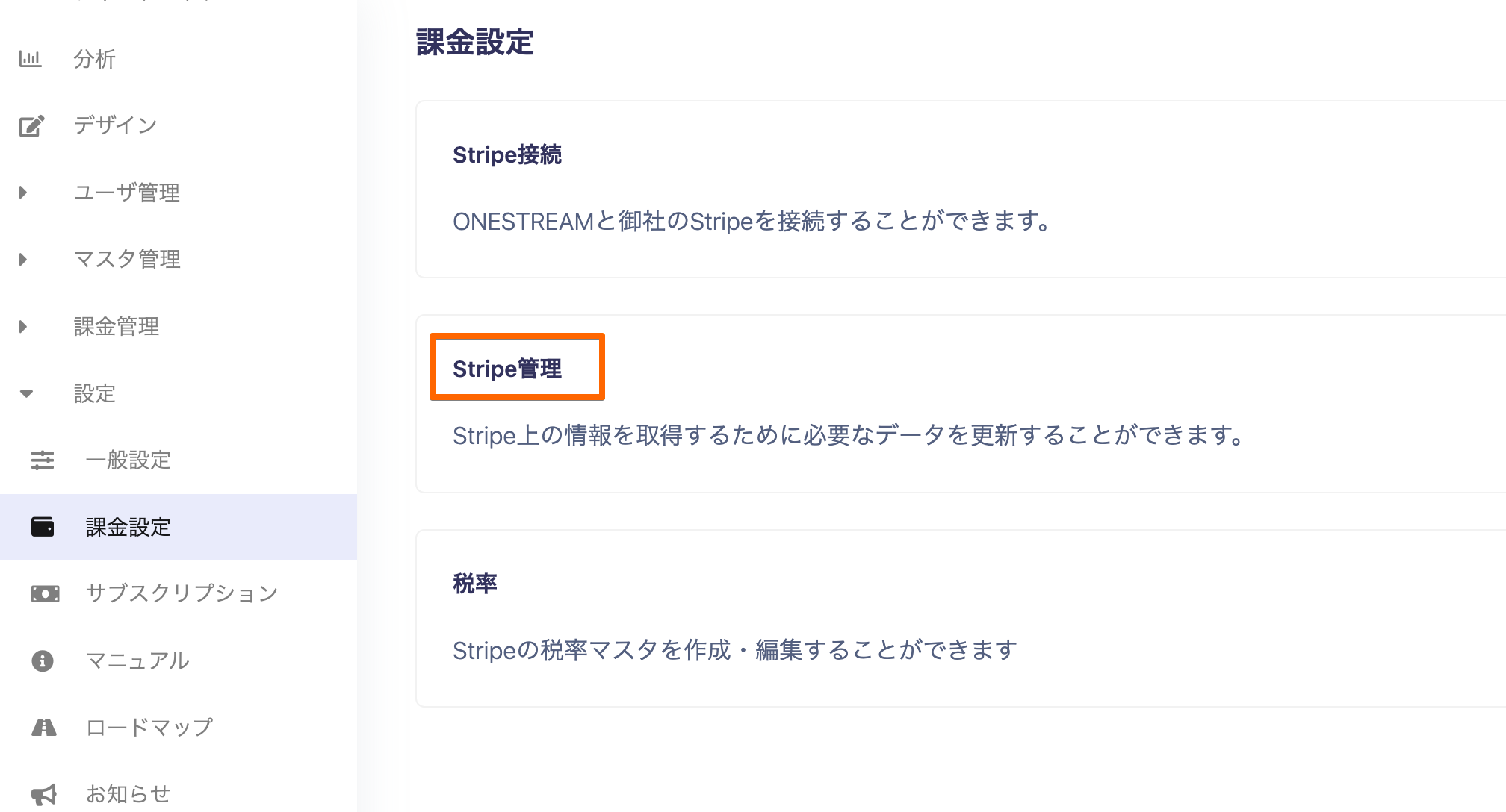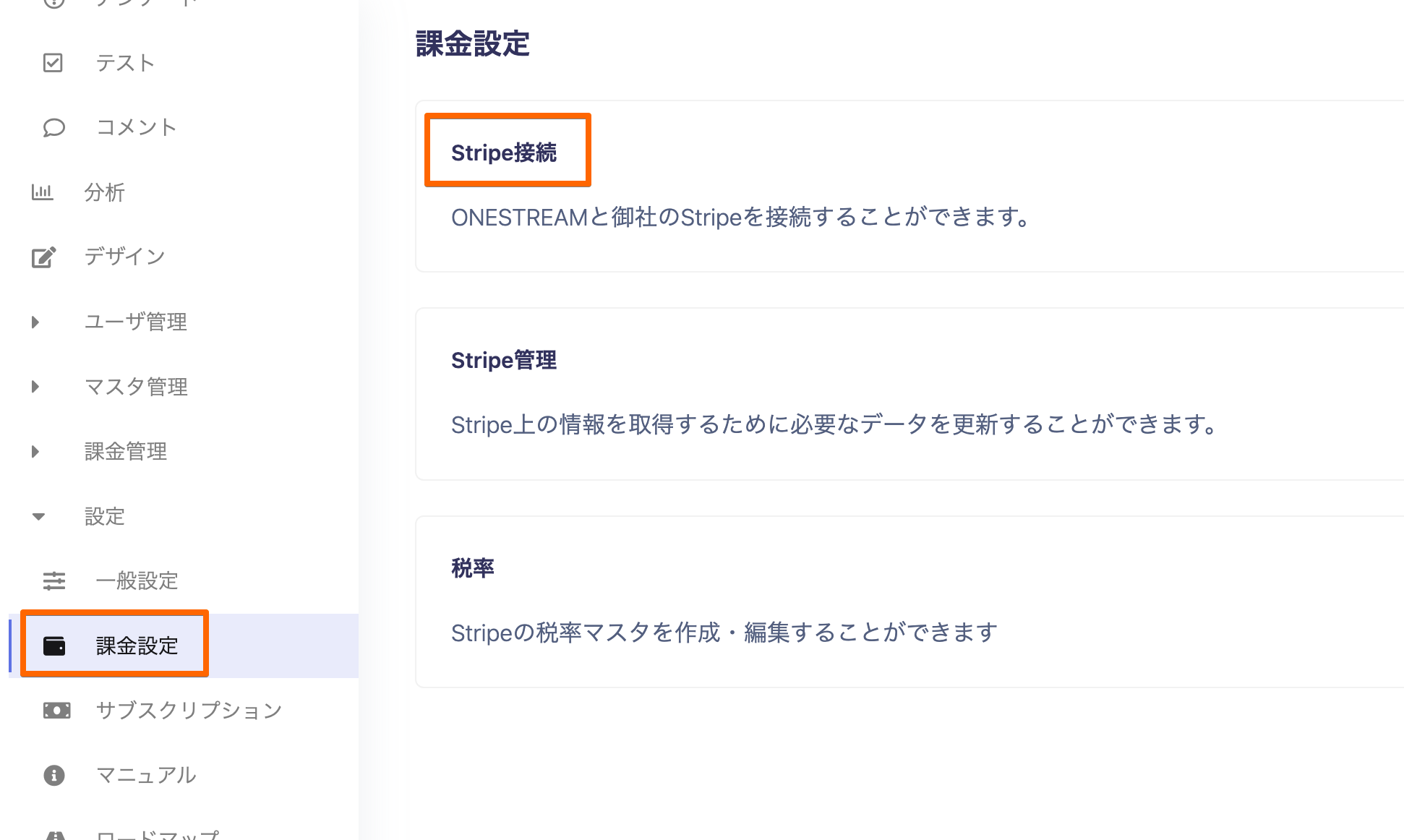 まず、設定⇒課金設定より【Stripe接続】を押下してください。