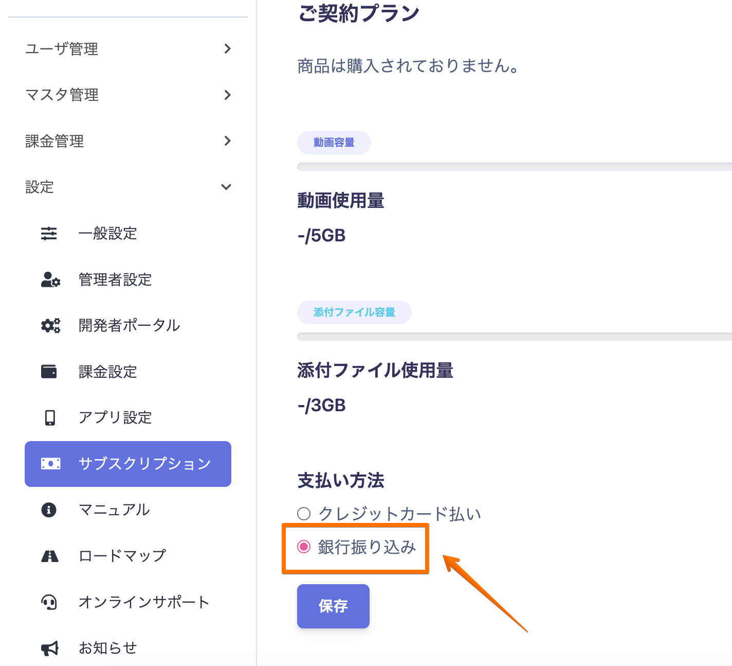 設定→サブスクリプション→ご契約プラン→支払い方法で「銀行振り込み」を選択してください。