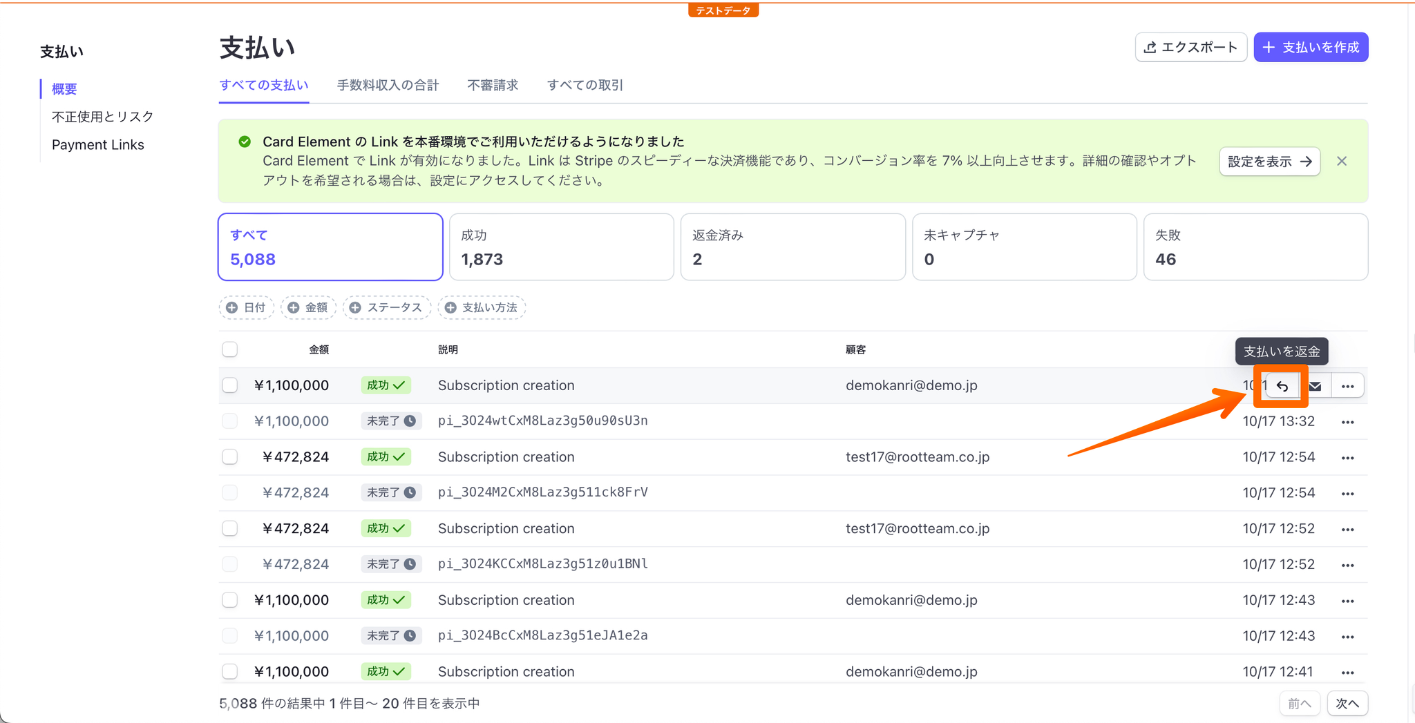 OneStreamはStripeとシームレスに同期していますので、返金が必要な場合は、Stripeのダッシュボードから手続きを行う必要があります。